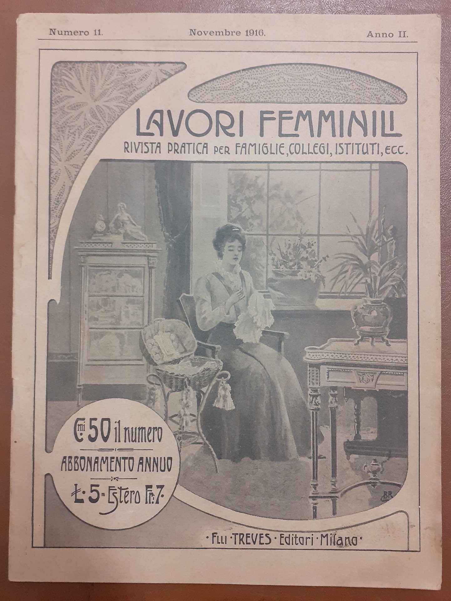 Lavori femminili. Rivista pratica per famiglie, collegi, istituti, ecc., F. lli Treves Editori, Milano, anno II, numero 11, novembre 1916, pp. 322-350, ill. b.n., cm 30. Leggera brunitura della carta, per il resto ottimo esemplare.
