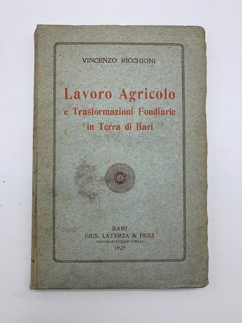 In 8 (cm 14 x 21,5), pp. IX + (1b) + 152 + (1) + (3 bianche). Brossura editoriale. Studio delle tre tipiche economie agrarie della provincia di Bari negli anni Trenta: zona della cultura intensiva, dove vige la piccola e piccolissima proprieta'; zona suscettibile di intensificazione produttiva, dove predomina la media proprieta', e, infine, la zona della cultura estensiva dove il latifondo tiene ancora il suo impero incontrastato.