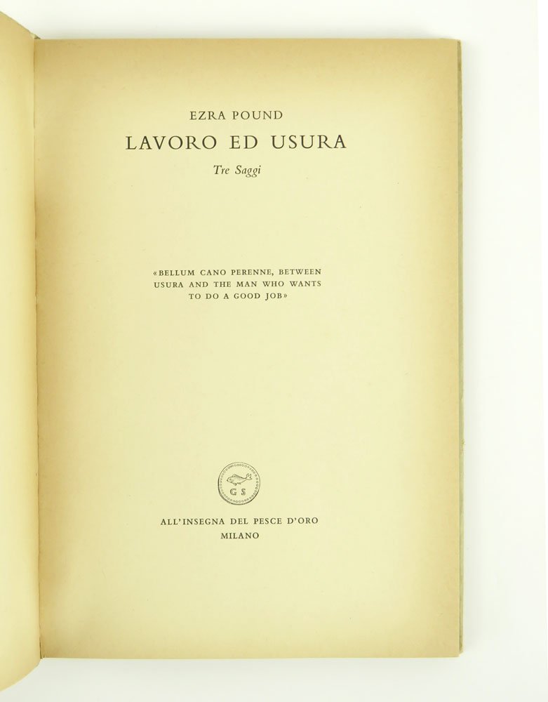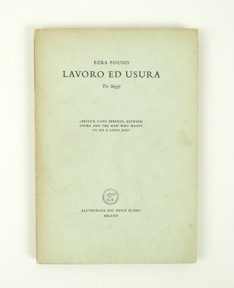 LIBROPrima edizione della raccolta.Scoloritura perimetrale alla sovracoperta; ma buon esemplare. Copia n. 796/1000.Edizione in 1000 esemplari numerati. Il volume raccoglie, con correzioni e aggiunte dell'A., i saggi: «Oro e lavoro» ([Rapallo, Tip. Moderna, 1944]), «L'America, Roosvelt e le cause della guerra presente» (Venezia, Casa editrice delle edizioni popolari, 1944), «Introduzione alla natura economica degli S.U.A.» (ibidem). «La presente edizione vuole [.] sfatare la crudele leggenda del suo antisemitismo per orribili e assurdi motivi razziali» (p. 99, Nota dell'Editore).Gallup, A Bibliography of Ezra Pound, A68