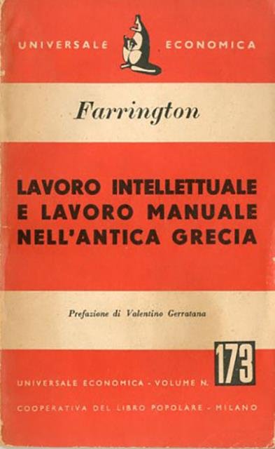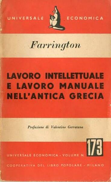 179 p. : ill. ; 18 x 11 cm. Universale economica. Storia e filosofia, 173. Questo libro si compone di quattro saggi che trattano storicamente, cioè in stretto rapporto con il rispettivo ambiente sociale, quattro grandi movimenti del pensiero antico. Il primo saggio studia il carattere del primo grande periodo della scienza greca, e dimostra che essa, pur non essendo ancora sperimentale, non era neanche puramente speculativa, essendo in realtà strettamente legata alla pratica. I filosofi ionici non erano semplici osservatori della natura, ma interferivano attivamente in essa: il filosofo e l’uomo d’azione erano ancora una cosa sola. Il secondo saggio descrive gli effetti prodotti sull’arte e sulla scienza medica dai mutamenti sociali, che sono stati pure mutamenti del modo di considerare il lavoro manuale e i lavoratori manuali. I medici ippocratici, giustamente famosi per il fatto che consideravano il paziente come un organismo vivo che lotta per mantenersi in equilibrio con l’ambiente, trascuravano il fattore principale dell’ambiente dell’essere umano: il suo lavoro. Ora la società agisce nell’individuo in primo luogo attraverso il lavoro. E se l’individuo non riesce a reagire adeguatamente all’ambiente, quelle che vanno mutate sono spesso appunto le sue condizioni di lavoro. Il terzo saggio tratta dello stoicismo, come movimento vivo e in continuo sviluppo attraverso i cambiamenti dell’ambiente. Guardando con gli occhi dello storico Diodoro Siculo, possiamo vedere lo stoicismo come un sistema di vita con molti aspetti di origine orientale. Influenzato dapprima dalla fede astrologica in una giusta società, esso indusse a critiche radicali delle ingiustizie nella società greca. Più tardi, come scuola di rassegnazione, fini col diventare il cemento sociale dello Stato romano che, col suo aiuto, si servi della religione come mezzo di controllo politico. Il quarto saggio mostra appunto come la mite religione e l’ardita scienza di Epicuro, la cui rapida diffusione attraverso l’Italia minacciava di privare la superstizione della sua funzione politica, abbia allarmato la classe dirigente a Roma e provocato una lotta intellettuale in cui furono avversari lo statista Cicerone e il poeta Lucrezio. A cura di Valentino Gerratana. Titolo originale dell'opera: «Head and hand in ancient Greece». Brossura editoriale, coperta in cartoncino flessibile colorato (b/n e rosso), titolo impresso al piatto e al dorso. Leggero ingiallimento della carta, qualche segno del tempo ai profili della coperta, per il resto esemplare integro. Codice libreria 6954.