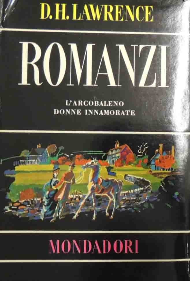 David Herbert Lawrence, Romanzi 2. L’arcobaleno. Donne innamorate, traduzioni di Lidia Storoni Mazzolani, Arnoldo Mondadori Editore, s.l. (ma stampato a Verona presso le Officine Grafiche dell’Arnoldo Mondadori Editore) 1964, prima ed., pp. XXXIX, 1241, 1 c. di tav. f.t. ill. b.n. con ritratto dell’autore in antiporta, cm 20, tela ed. con titoli in oro al dorso, taglio superiore spruzzato di rosso, sovraccoperta e cofanetto in cartoncino ed. Collana I classici contemporanei stranieri. Tutte le opere di David Herbert Lawrence, a cura di Piero Nardi, n. 4. Titoli delle opere originali: The rainbow – Women in love. Strappetti al cofanetto,minime tracce d’uso alla sovraccoperta, per il resto molto ben conservato.
