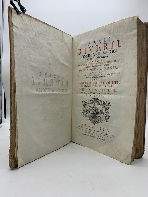 In folio (cm 23,5 x 38), pp. XXIX + 572 + 208 con un'illustrazione a piena pagina (146) della seconda parte raffigurante uno strumento medico, lo pneumatolabium. Gora al margine superiore delle pagine. Legatura coeva in piena pergamena con mancanza nella parte superiore del piatto posteriore. Edizione settecentesca, stampata a Venezia, dell'opera di medicina di Lazare Riviere (1589-1655). L'opera si divide in due parti e comprende: "Institutionum Medicarum Libri V - Praxeos Medicae Libri XVII - Observationum Medicarum & Curationum insignium Centuriae quatuor, cum Observationibus rarioribus, & ab alijs communicatis - Arcana, nusquam in lucem edita" e "De Dyspnoea" di Fabrizio Bartoletti (1586-1630).