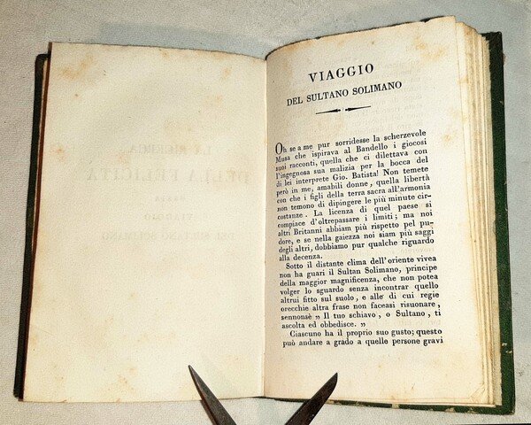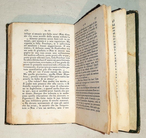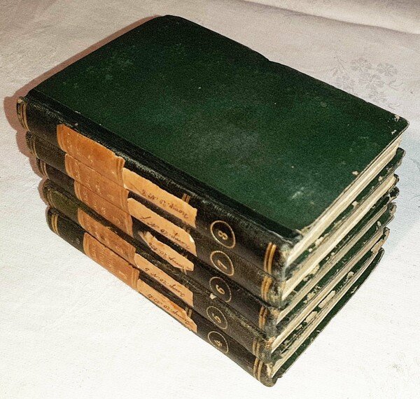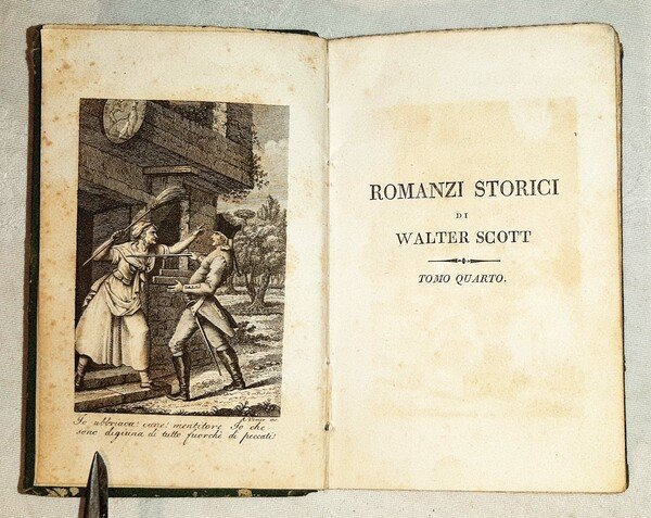 in-12°, 142x92 mm, leg. coeva in mezza pelle e carta, titolo dorato su tassello al dorso, antica etichetta in carta con indicazioni manoscritte di biblioteca privata incollata al dorso; pp. 203, [1], [1] c. di tav. : ill. calcogr.; 202; 195, [1]; 193, [3]; 196. Opera completa, 5 tomi (dal 4 all'8), facente parte della Collezione "Romanzi storici di Walter Scott". Rif.: IT\ICCU\UBOE\046287; IT\ICCU\UBOE\046288; IT\ICCU\UBOE\046289; IT\ICCU\UBOE\046290 e IT\ICCU\UBOE\046291. Cond.: Tracce d'uso alla legatura (lievi abrasioni). Occasionali fioriture, rari aloni d'umido. Opera completa e in condizioni buone.