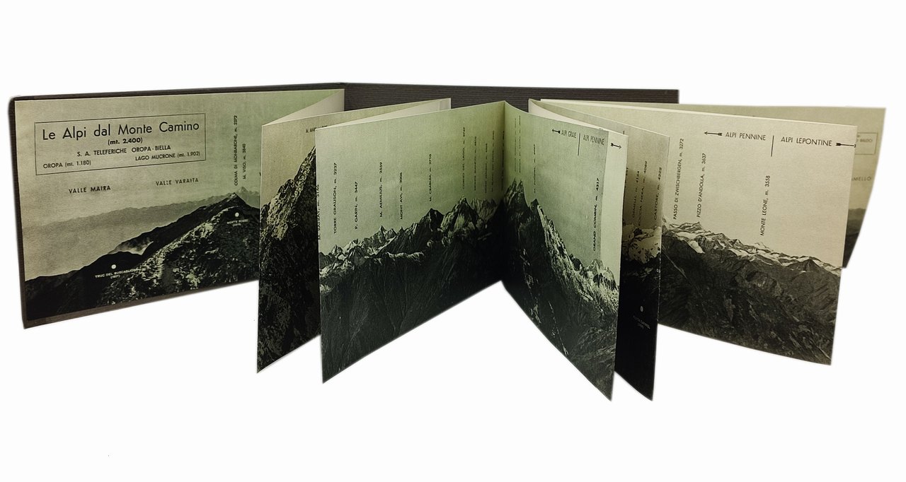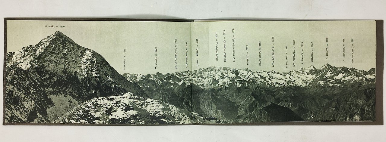 Direzione e toponomastica: Guido Negro. Fotografia: Aldo Blotto Baldo. Collaboratore: Guido Baucero. Panorama fotografico, composto da 12 pagine, ripiegato a fisarmonica, riportante l'indicazione dei nomi e delle quote delle vette (nonchè delle valli, dei colli, dei rifugi, dei ghiacciai, e delle punte) partendo dalla Valle Maira al Gruppo Bernina - Disgrazia - Adamello. Senza data (ma sicuramente risalente ai primi decenni del '900). Brossura editoriale con cartoncino flessibile con titoli sul piatto anetriore. Lunghezza dell'intero panorama fotografico aperto: 326 x 15 cm circa. Formato del panorama ripiegato all'interno della brossura: 28,5 x 16 cm circa. Ottima conservazione. Da collezione.