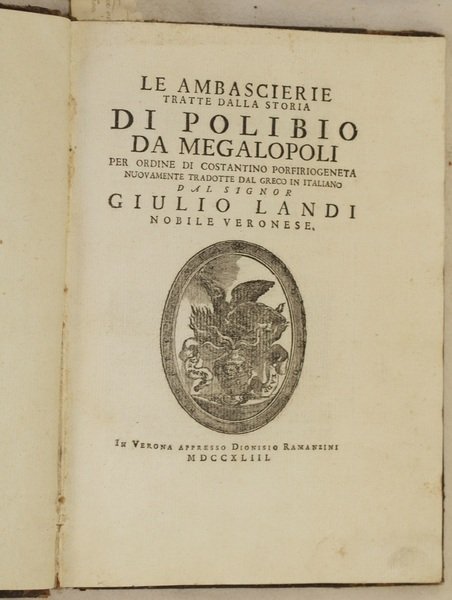 LE AMBASCIERIE TRATTE DALLA STORIA DI POLIBIO DA MEGALOPOLI PER ORDINE DI COSTANTINO PORFIRIOGENETA NUOVAMENTE TRADOTTE DAL GRECO IN ITALIANO DAL SIGNOR GIULIO LANDI