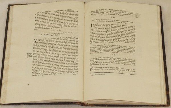 In 4. Dim. 27,5x19,5 cm. Pp. 255+(1). Bella edizione del 1743 di questa opera dello storico greco Polibio da Megalopoli (200 ca-120 a.c. circa). Nelle sue "Storie" Polibio descrive come i romani sottoposero al loro predominio il mondo conosciuto. L'opera era formata da tre volumi, siamo purtroppo in possesso solo del terzo tomo contenente Le Ambascierie. Traduzione in italiano a cura di Giulio Landi (1498-1579), erudito autore di saggi morali e di opere burlesche firmato con lo pseudonimo di Sere Stentato e traduttore dal greco. Alla fine cronologia e tavola dei nomi propri antichi e moderni. In ottime condizioni e in se completo. Copertina in mezza pelle coeva con titolo su tassello al dorso in buone condizioni generali con usure ai margini e dorso. Legatura in ottime condizioni. All'interno le pagine si presentano in ottime condizioni con rare fioriture. Beautiful edition of 1743 of this work by the greek histroian Polibio da Megalopoli (200 ca-120 a.c. circa). In his "Storie" Polibio describes how romans dominated the known world. The work was made up of three volumes, unfortunately we only have the third tome containing Le Ambascierie. Translation in italian language by Giulio Landi (1498-1579), educated scholar of moral essays and burlesque works signed with the pseudonymous of Sere Stentato and translator from greek language. At the end chronology and and chart of ancient modern names. In very good conditions and complete. Half leather coeval cover with spine title leather label in good general conditions with wearings in the edges and spine. Binding in very good conditions. Inside pages are in very good conditions with occasional foxings.