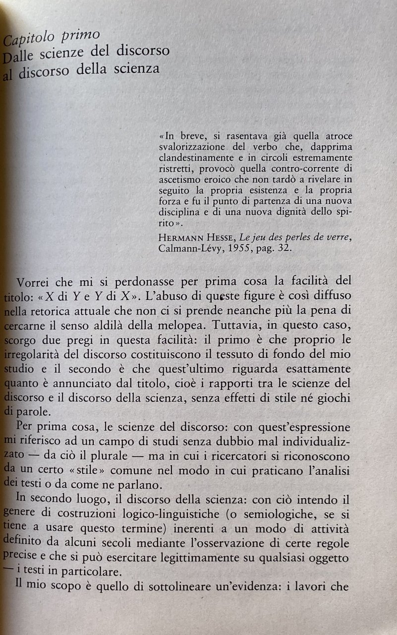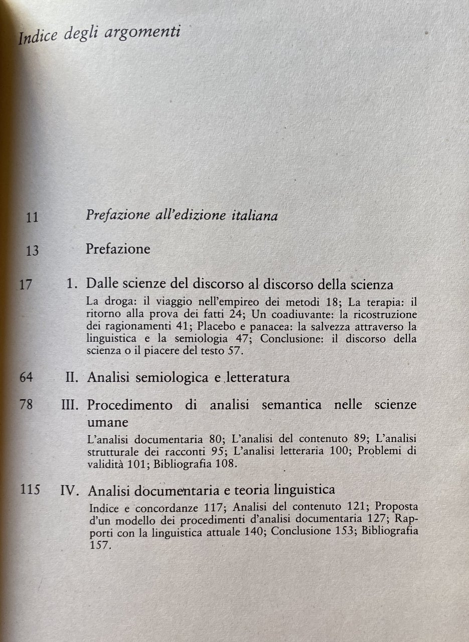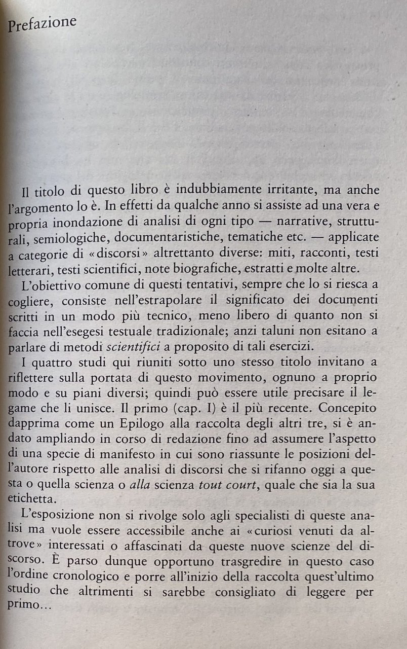 Alcuni settori delle scienze umane sembrano a volte in preda d'una sorta di congestione o di delirio verbale, attraversati e contesi come sono da un'alluvione di discorsi e di statuti eterogenei della ricerca. Gli studi riuniti in questo volume invitano a interrogarsi sul senso di certi panorami disciplinari tumultuosi, da un punto di vista tecnico che è poi riducibile a queste domande complessive: qual è lo statuto autentico d'alcuni metodi dell'analisi contemporanea, in rapporto al modelli che li hanno preceduti? Sono essi davvero, come spesso affermano, più scientifici? Quali rapporti veri (cioè, non metaforici) si possono stabilire, tra questi metodi e quell'analisi linguistica cui si rivolgono o si affidano tanto frequentemente? Che posto ha, infine, l'analisi semiologica, in quest'universo. oscillante tra la prova dei fatti e la costituzione totalitaria del Segno? Le analisi dei discorsi si propone dunque come contributo alla critica della semiologia in quanto pantologia e come invito ad una riflessione più pertinente sui rapporti tra linguistica e scienze umane, oggi.