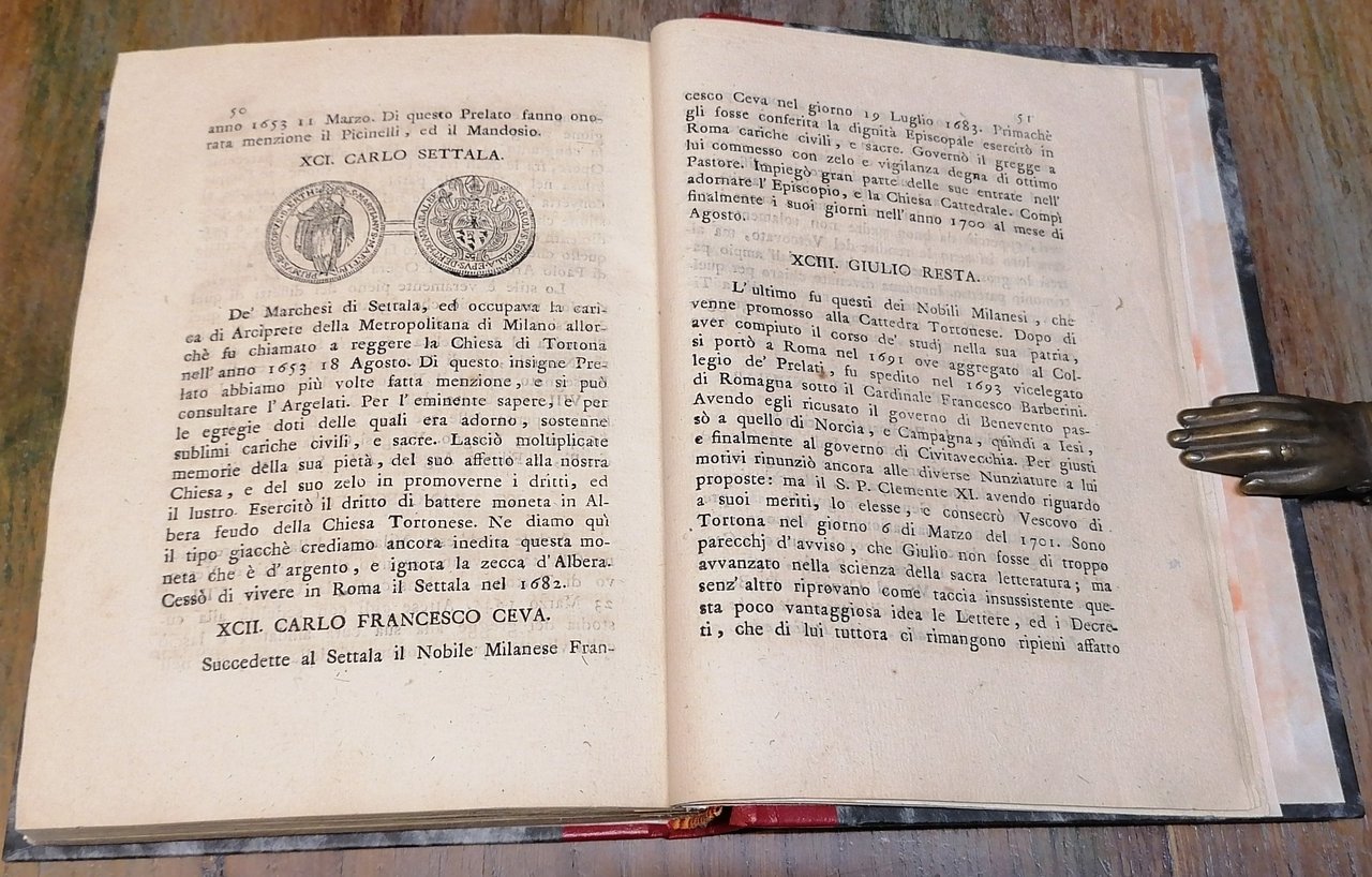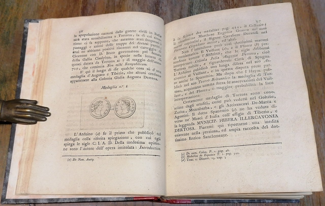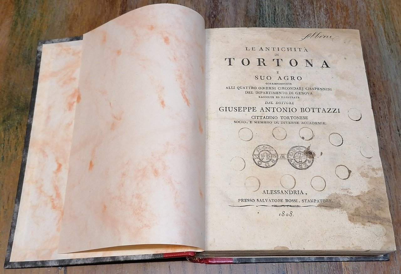 (Storia locale - Piemonte - Provincia di Alessandria) In 8°, legatura moderna in mezza pelle rossa, dorso a 5 nervi con titoli e filetti impressi in oro, pp. XII,320,56,(4), con tre piccole incisioni in rame di medaglie ed una in xilografia nel testo, una tavola ripiegata con parte della Tavola Peutingeriana alla fine del volume. Appendice con "Serie de' vescovi di Tortona" con numerazione propria (1-56). Frontespizio con macchie ed una firma al margine superiore, una macchia lungo il margine bianco del taglio davanti da pagina 1 a pagina 10, un restauro all'angolo inferiore di pagina 227, due note manoscritte a pagina 56 dell'Appendice ed al recto del foglio di errata, peraltro esemplare ben conservato. Edizione originale.