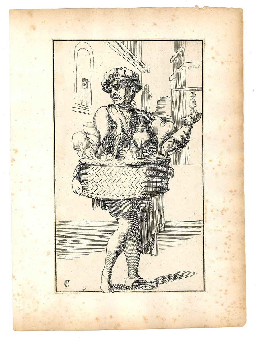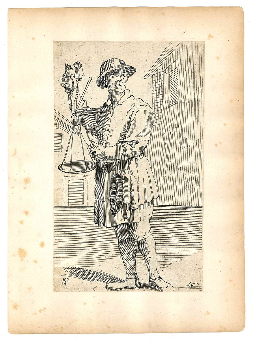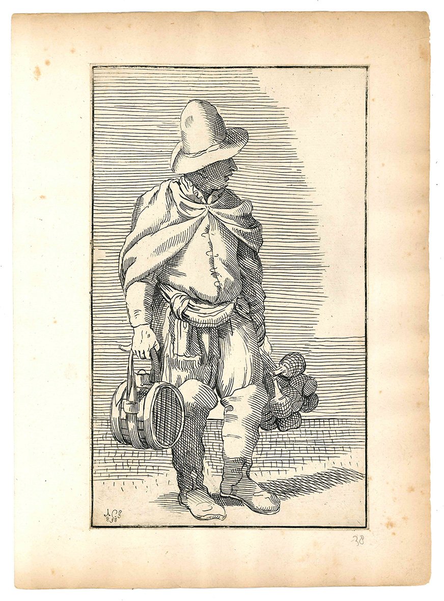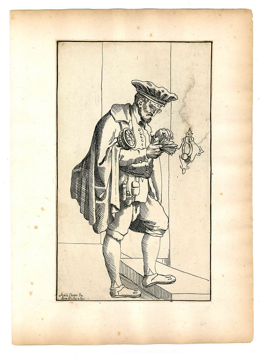 Questa celebre suite che raffigura artigiani di strada, venditori ambulanti ed altri personaggi che s'incontravano per le vie di Bologna, fu realizzata da Annibale Carracci sul finire del Cinquecento. Diversi anni dopo la sua morte i disegni furono incisi in rame da Simon Guillain, un artista francese allievo dell'Algardi, e furono stampati a Roma nel 1646 in due diverse edizioni. Le incisioni vennero poi ristampate in terza e in quarta tiratura nel 1740 e nel 1776 dal Roisecco; queste due tirature più tarde si distinguono dalle due precedenti per la nuova numerazione dei rami e l'aggiunta dei nomi dei mestieri (cfr. A. Marabottini, a cura di, Le arti di Bologna di Annibale Carracci, Roma, 1966).