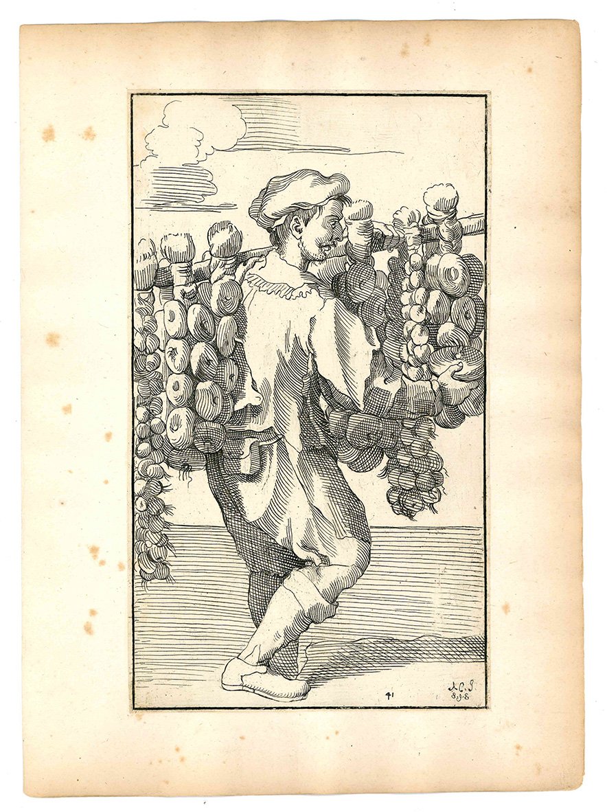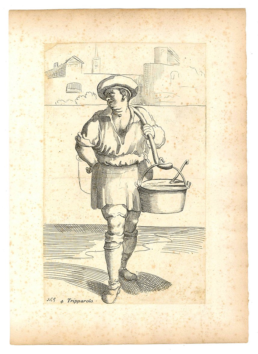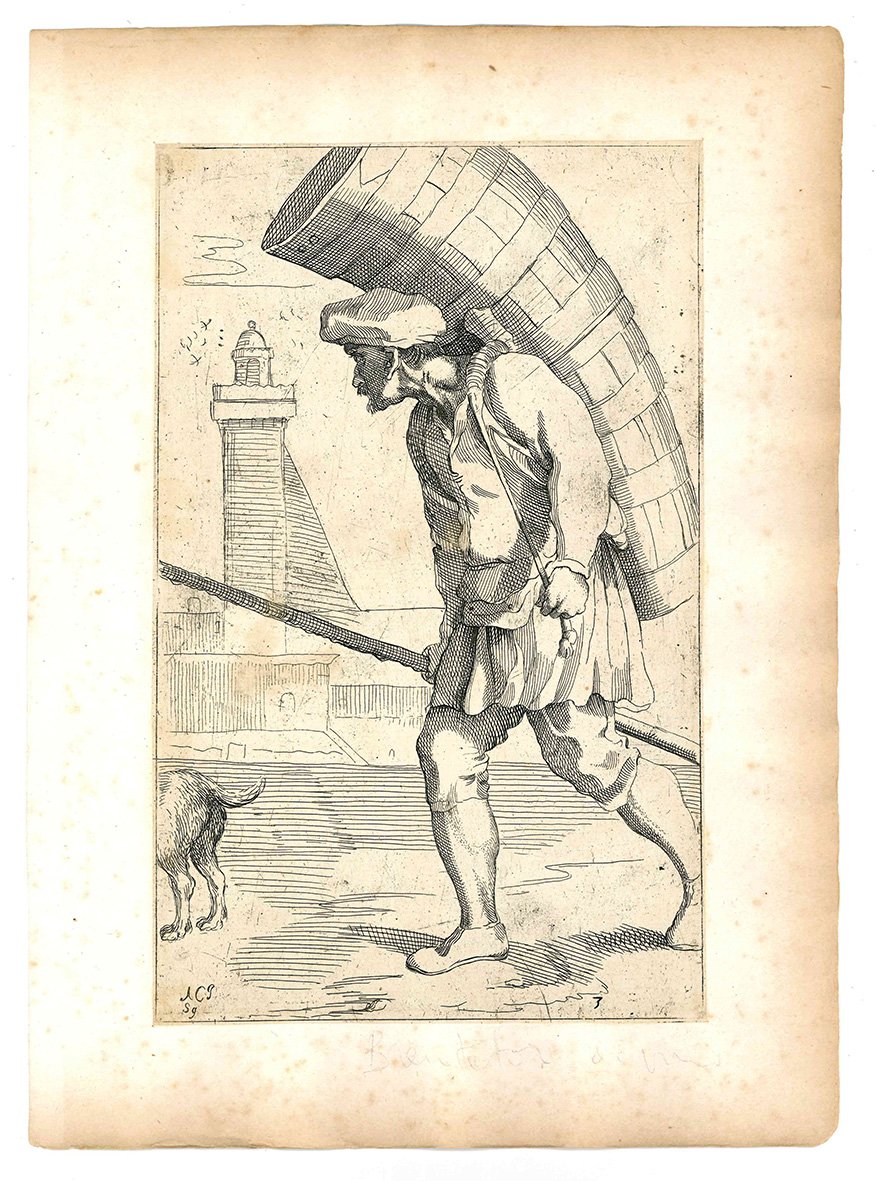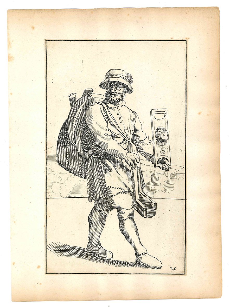 Questa celebre suite che raffigura artigiani di strada, venditori ambulanti ed altri personaggi che s'incontravano per le vie di Bologna, fu realizzata da Annibale Carracci sul finire del Cinquecento. Diversi anni dopo la sua morte i disegni furono incisi in rame da Simon Guillain, un artista francese allievo dell'Algardi, e furono stampati a Roma nel 1646 in due diverse edizioni. Le incisioni vennero poi ristampate in terza e in quarta tiratura nel 1740 e nel 1776 dal Roisecco; queste due tirature più tarde si distinguono dalle due precedenti per la nuova numerazione dei rami e l'aggiunta dei nomi dei mestieri (cfr. A. Marabottini, a cura di, Le arti di Bologna di Annibale Carracci, Roma, 1966).