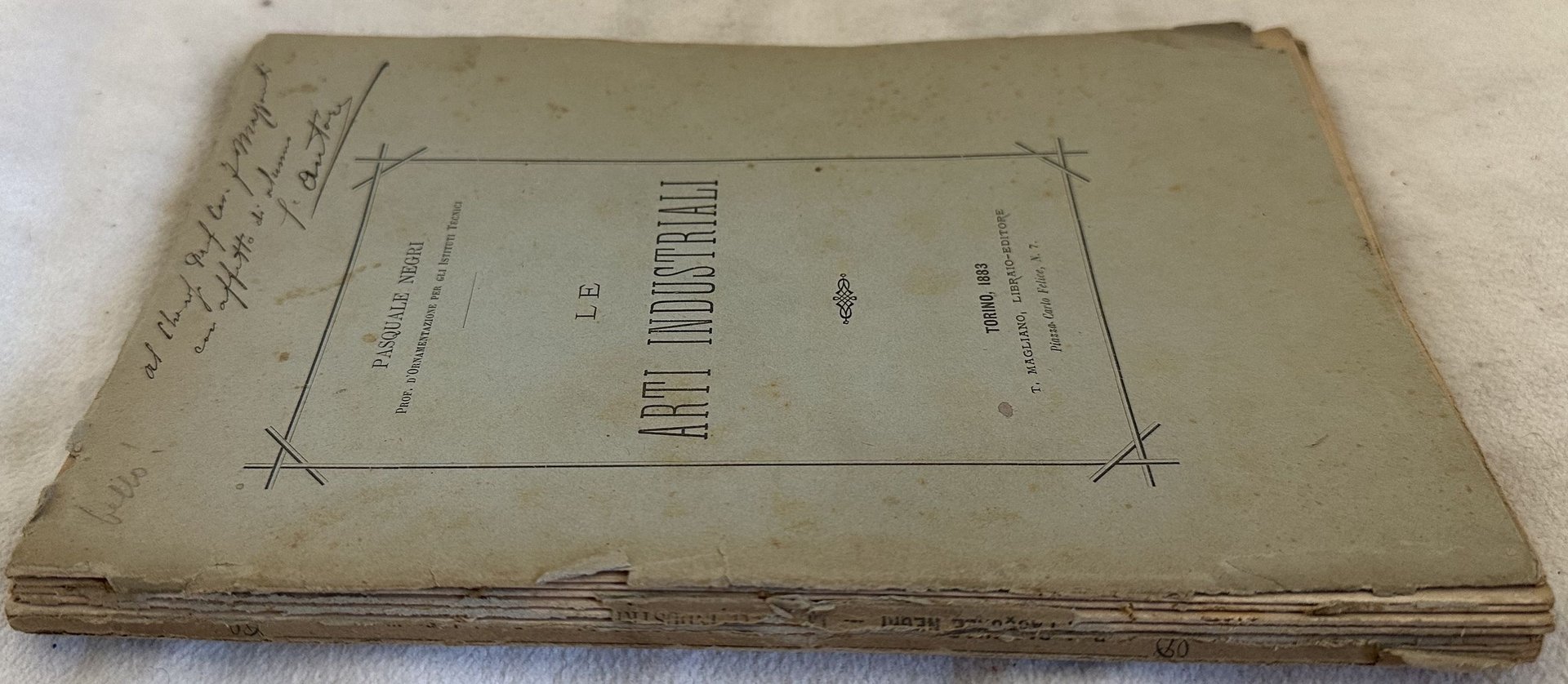 Edizione del 1883 di questa opera sulle arti industriali di Pasquale Negri. All'interno: Condizione dell'arte industriale nell'antichità e ai giorni nostri; Origine di quest'arte e suo sviluppo nella antichità nel Medio Evo e nell'epoca moderna; Considerazioni sull'arte industriale moderna e conclusione ecc. Dedica autografa dell'autore in copertina senza firma In mediocri condizioni. Copertina editoriale in discrete condizioni generali con lievi usure ai margini e dorso. Legatura in mediocri condizioni. All'interno le pagine si presentano in buone condizioni con fioriture. In 8. cm 21,5x14. Pp. 137+(3).Edition of 1883 of this work about industrial arts by Pasquale Negri. Autographed dedication of the author in the cover without signature. In poor conditions. Editorial cover in fair conditions general conditions lightly worn in the extremities. Binding in poor conditions. Pages in good conditions with foxing. In 8. cm 21,5x14. Pp. 137+(3).<BR><BR>