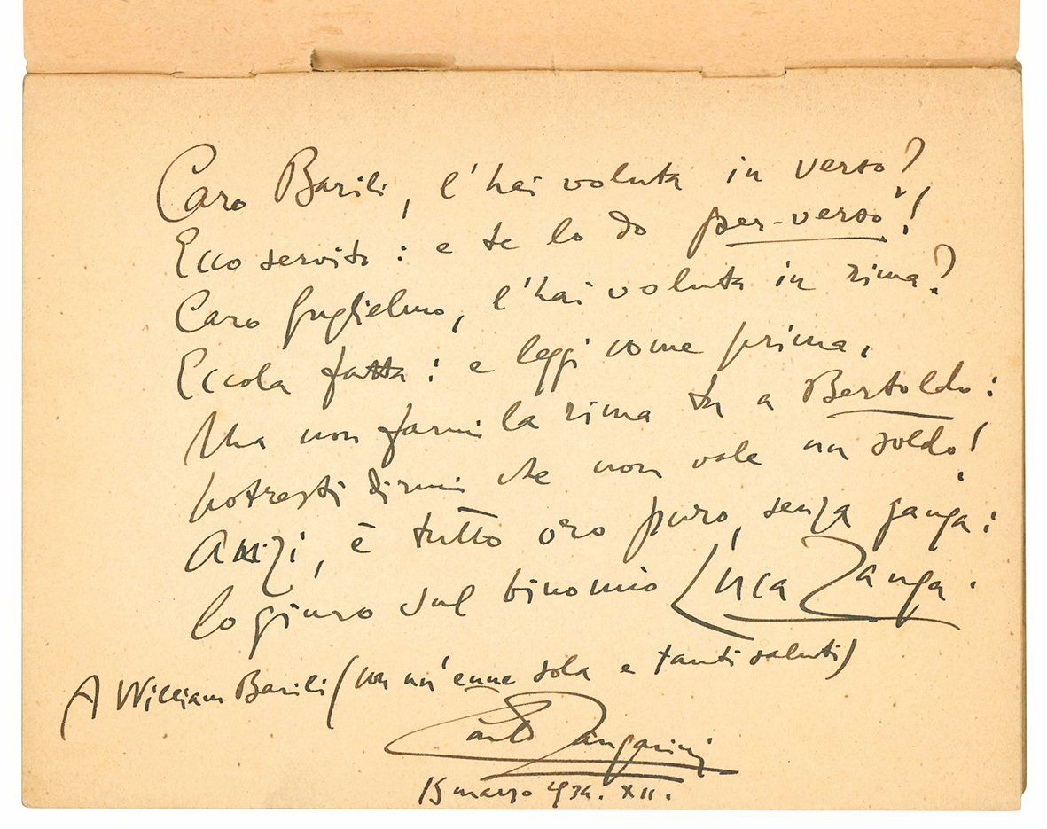In 8vo (mm 214x157); pp. 71, [1]. Brossura editoriale illustrata da Umberto Tirelli. Piccole mancanze al dorso. Spiritosa dedica autografa in rima dell'autore al recto della prima carta destinata a Guglielmo Barili, autore attivo nella prima metà del XX secolo.