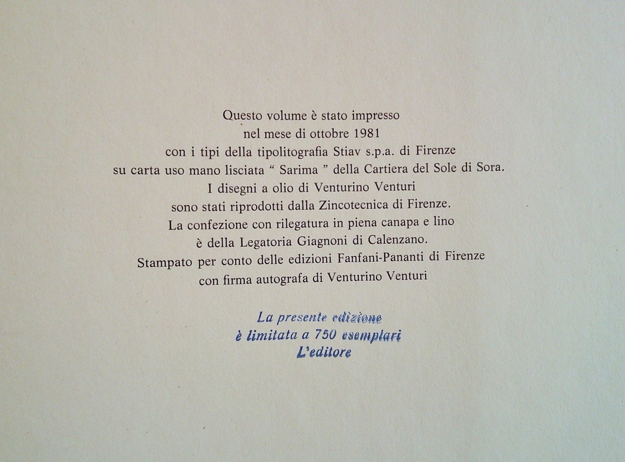 37 tavole a colori f.t. di Venturino Venturi nel Centenario della Prima Edizione 1883-1993. Edizioni Fanfani Pananti - Firenze, 1981. Edizione in Tiratura Limitata a 750 esemplari firmati a mano dall'autore. Legatura in piena Canapa e Lino, con titoli in tinta al piatto e al dorso, con sovraccoperta originale in cofanetto in cartone editoriale con targhetta. Stampato su carta uso mano lisciata "Sarima" della legatoria Giagnoni di Calenzano. 35,5x50; pp.172. Raro e in Stato di Nuovo. , Ottimo (Fine)