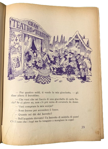 19,5 x 27 cm, 211, (3) pp. e 15 c. di tav. illustrate da Jacovitti e dipinte da Aristide Longato Illustrazioni: Jacovitti. Diverse illustrazioni nel testo. Legatura editoriale in cartoncino rigido illustrato. Bellissime carte di sguardia. Una tavola presenta uno strappo riparato e qualche traccia di sporco e per il resto, l'esemplare è in buone condizioni di conservazione. Non comune terza edizione del Pinocchio, illustrato da Jacovitti.