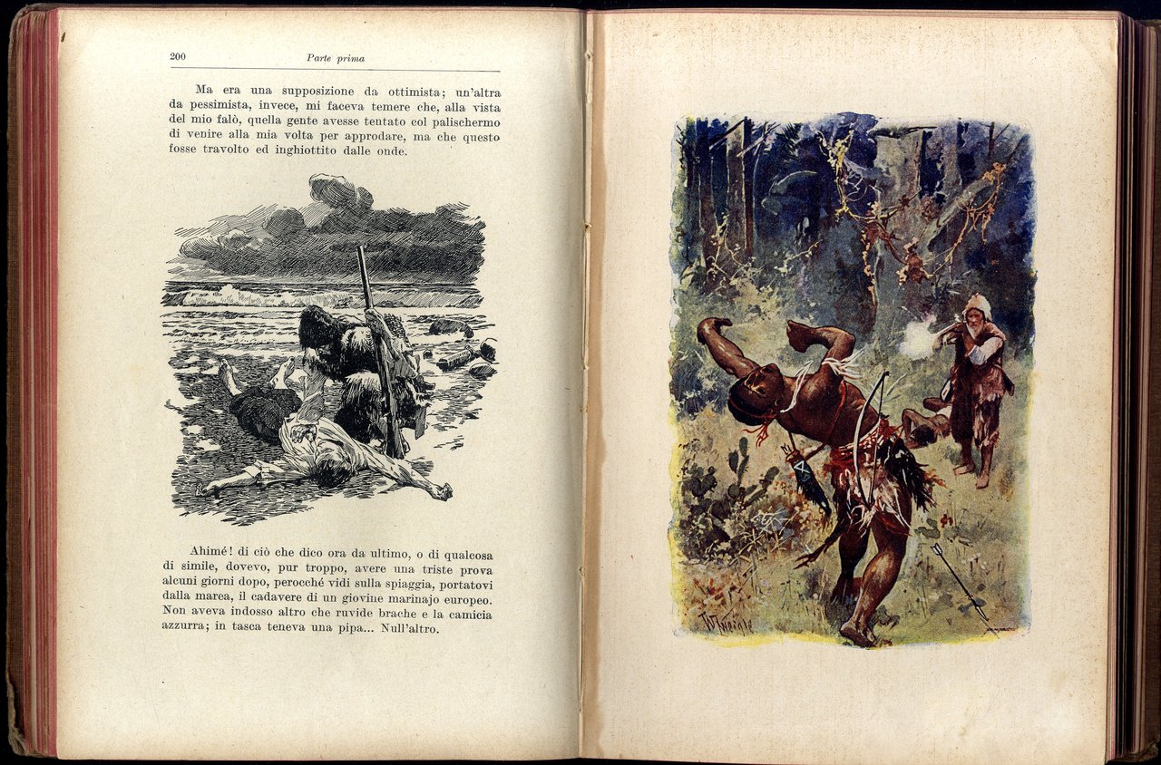 >in-8, pp. XII, 528, con sei tavole a colori. Legatura editoriale in tela figurata a colori, tagli rossi. Terza edizione Hoepli di questo grande classico per ragazzi, ben illustrato a nero e a colori; non comune. Buon esemplare (legatura un po' stanca e comune, uniforme, brunitura della carta).