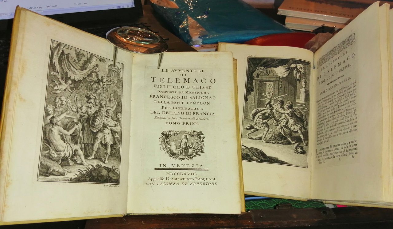 In-8 (19 cm) (10) 367 (15) c. (tavole di cui 1 ripiegata); (13) c. (tavole) 316. Marca editoriale sul frontespizio Apollo in piedi con libro aperto testa in gloria con motto: La Felicità delle Lettere. Frontespizi calcografati. Testatine. Antiporta calcografica sottoscritta da Antonio Baratti. Piena pergamena. Esemplare in ottime condizioni. Fénelon François de Salignac de La Mothe (1651-1715): predicatore, teologo e pedagogo, arcivescovo di Cambrai, precettore di Luigi di Borbone, duca di Borgogna (1682-1712). Nato a Sainte-Mondane e morto a Cambrai. (boards of which 1 folded); (13) c. (plates) 316. Publishing mark on the title page Apollo standing with an open book, head in glory with the motto: La Felicità delle Lettere. Chalcographed title pages. Heads. Antiporta intaglio signed by Antonio Baratti. Full parchment. Fénelon François de Salignac de La Mothe (1651-1715): preacher, theologian and pedagogue, archbishop of Cambrai, tutor of Louis of Bourbon, Duke of Burgundy (1682-1712). Born in Sainte-Mondane and died in Cambrai.