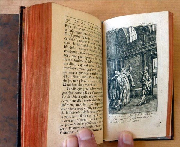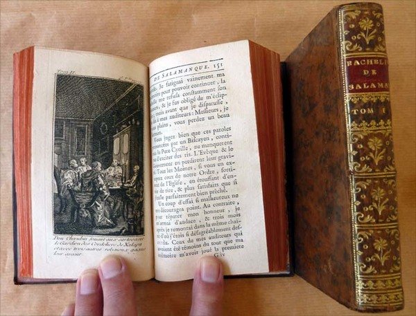 Ensemble de deux volumes de format in 12 de: pour le Premier volume Vie de M. Le Sage, en tout XLVIII pp. ; ; (1ère, 2ème et 3ème parties); faux titre, frontispice gravé, titre; 392 pp.; 5 gravures hors texte . Pour le Second volume (4ème, 5ème et 6ème parties); 395 pp.; 4 gravures hors texte. Catalogue détaillé de l'éditeur en fin (dans la pagination). Reliure de l'époque en pleine basane marbréedos lisse, caisons richement ornés et dorés; titres dorés sur pièce de maroquin rouge. Filets sur les coupes. Tranches rouges. Quelques rares traces brunes dans le texte. Exemplaire désirable en très bel état. Voir les photos.