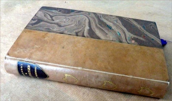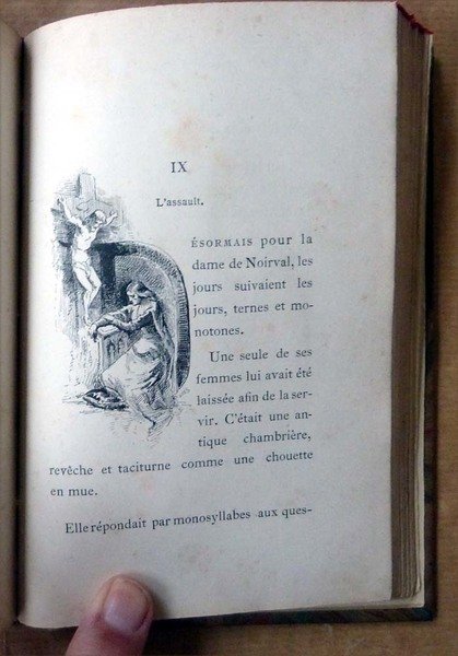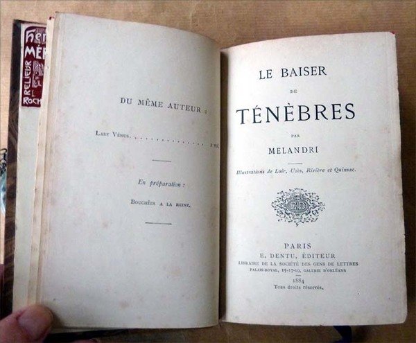 Un volume de format in 8° (12x18cm); de faux titre, titre, et deux ff. d'introduction; puis 274 pp. Reliure légèrement postérieure de Henry Mériot; relieur d'art estimé sis à Rochefort; demi veau blond à cheval; écussons et titres dorés au dos. tête rouge avec un décor doré. Curieuse couverture en hauteur, conservée. Nombreuses lettrines illustrées et illustrations dans le texte par Loir, Uzès, Rivière et Quinsac. Nombreuses et pâles rousseurs dans le corps du volume; déchirure restaurée à la page 181/182 mais l'ouvrage est très bien relié et en bel état. De la bibliothèque du relieur. Voir les photos. Très rare roman gothique; ténébreux, dans une curieuse édition populaire. Mélandri a fait partie des "Hydropathes.". Il collabora au "Chat Noir", au "Tintamarre", et, photographe reconnu, fit des clichés de Hugo, Sarah Bernhardt, Zola.