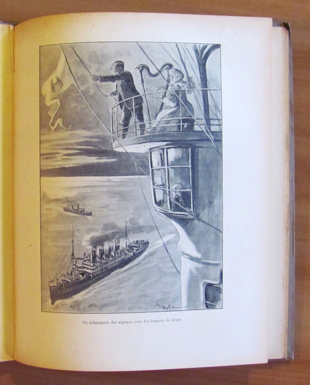 Molte illustrazioni in b/n n.t. e 10 tavole monocromatiche in b/n f.t. di A. Robida. Maison Alfred Mame et Fils - Tours, I edizione 1909. Tela editoriale splendidamente illustrata al piatto in colori e oro e titoli in oro al dorso. Tagli dorati alle pagine. Minime, sporadiche fioriture del tempo in pochissime pagine ma freschissimo e pulito. Rara I edizione non datata, normalmente ritenuta del 1910 ma il libro riporta una dedica del tempo al frontespizio datata Dicembre 1909 pertanto certamente stampato in quell'anno o poco prima. 22,5x28; pp.142. Raro e in Ottimo stato. , Molto buono (Very Good)