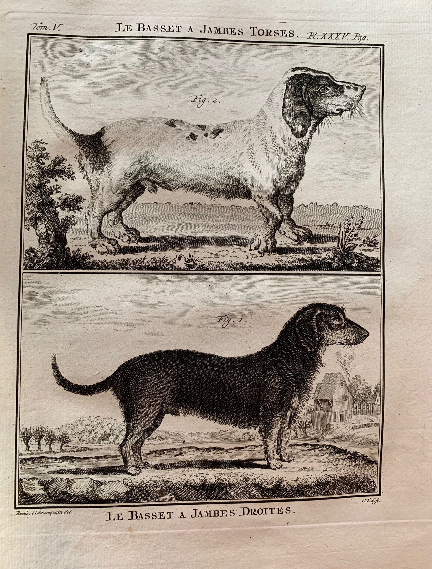 >incisione in rame mm 250x195 raffigurante due bassotti; titolo e dati tipografici impressi lungo il margine inferiore. Tratta dalla celebre opera di Buffon: Histoire générale et particulière, importante opera in 36 volumi dedicata alla storia naturale; pubblicata in Francia tra il 1749 e il 1789.