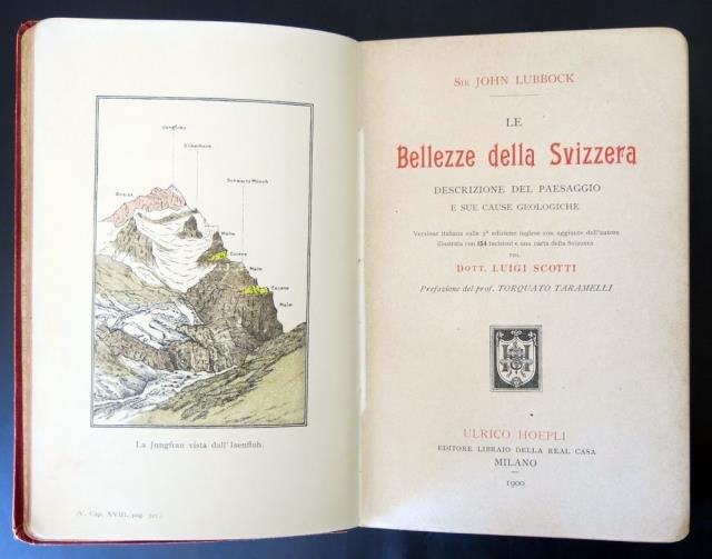 Versione italiana sulla terza edizione inglese con aggiunte dell'Autore illustrata con 154 inclusioni e una carta della Svizzera. Prefazione del Prof. Torquato Taramelli. Ulrico Hoepli, Editore Libraio della Real Casa, Milano, 1900. In 8vo, pp. XXXVIII (con Prefazione, Sommario dei Capitoli e Indice delle Figure) + 1 (Errata Corrige), 433 (con Appendici e Indice), con incisioni e foto in b/n n. t. + 1 carta della Svizzera (Fisica e Politica) in col. rip.in fine, bross. edit. in simil pelle rossa con titoli oro. Usuali difetti fisiologici del tempo di copertina, molto buono lo sttao di conservazione. .