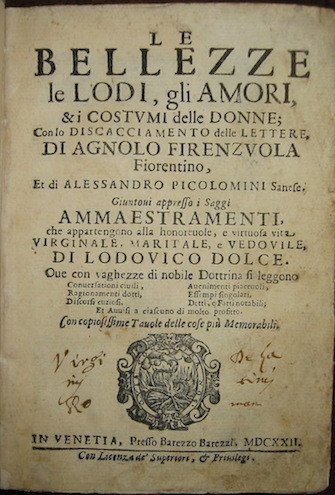 Le bellezze, le lodi, gli amori & i costumi delle donne con lo Discacciamento delle Lettere di Agnolo Firenzuola fiorentino, et di Alessandro Piccolomini sanese giuntovi appresso i saggi Ammaestramenti, che appartengono alla honorevole, e virtuosa vita virginale, maritale e vedovile di Lodovico Dolce.