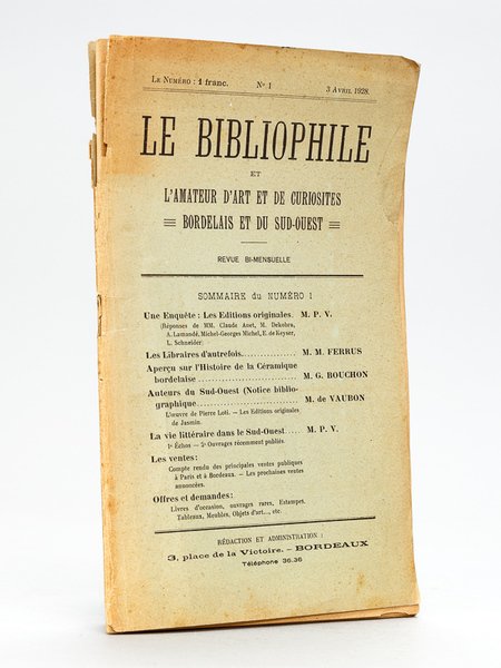 1 vol. in-8 br., 3 Place de La Victoire, Bordeaux, 1928, 48 pp. Rare exemplaire de ce premier numéro qui semble ne pas avoir connu de second numéro (un seul autre numéro un répertorié au CCfr). On peut y lire une enquête menée auprès d'écrivains sur la notion d'édition originale, une chronique de Maurice Ferrus sur les librairies d'autrefois (à Bordeaux), un aperçu illustré sur l'histoire de la céramique bordelais (par G. Bouchon), une bibliographie des oeuvres de Loti, une autre bibliographie des éditions originales de Jasmin, une bibliographie des "ouvrages récemment publiés par les Editeurs du Sud-Ouest", distinguant "ouvrages de luxe", "Roman, poésie, théâtre", "Histoire, Géographie, Voyages, Archéologie", etc. Etat moyen (couv. en partie débrochée avec mq. en dos, bon état intérieur)