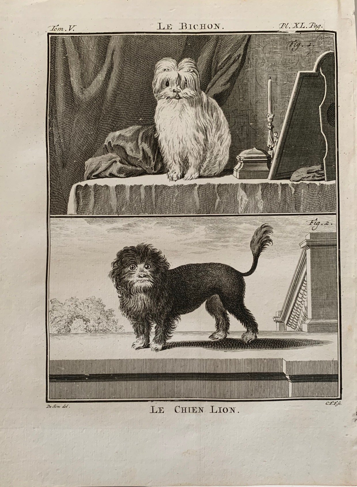 >incisione in rame mm 250x195. "Le Bichon/Le chien Lion" incisi in rame su un'unica lastra. Titolo e dati tipografici impressi lungo il margine inferiore. Tratta dalla celebre opera di Buffon: Histoire générale et particulière, importante opera in 36 volumi dedicata alla storia naturale; pubblicata in Francia tra il 1749 e il 1789.