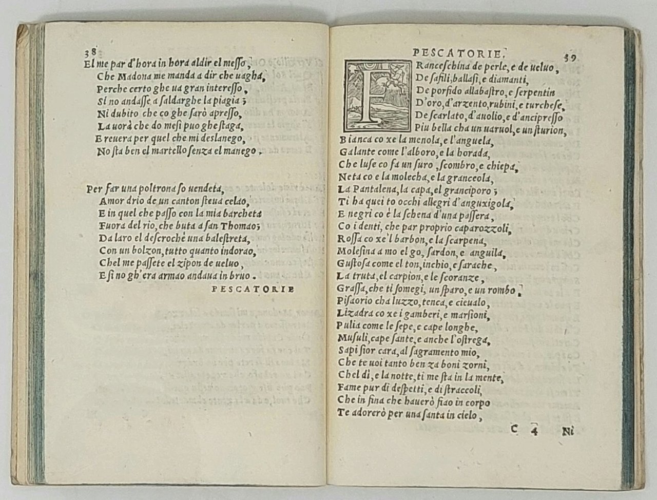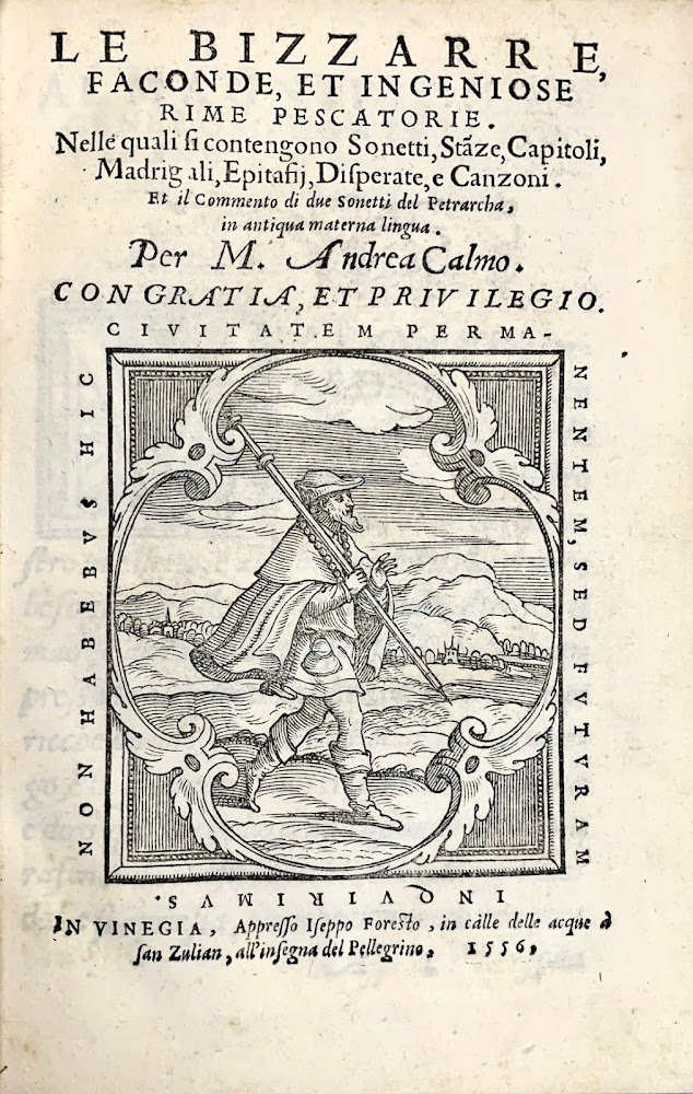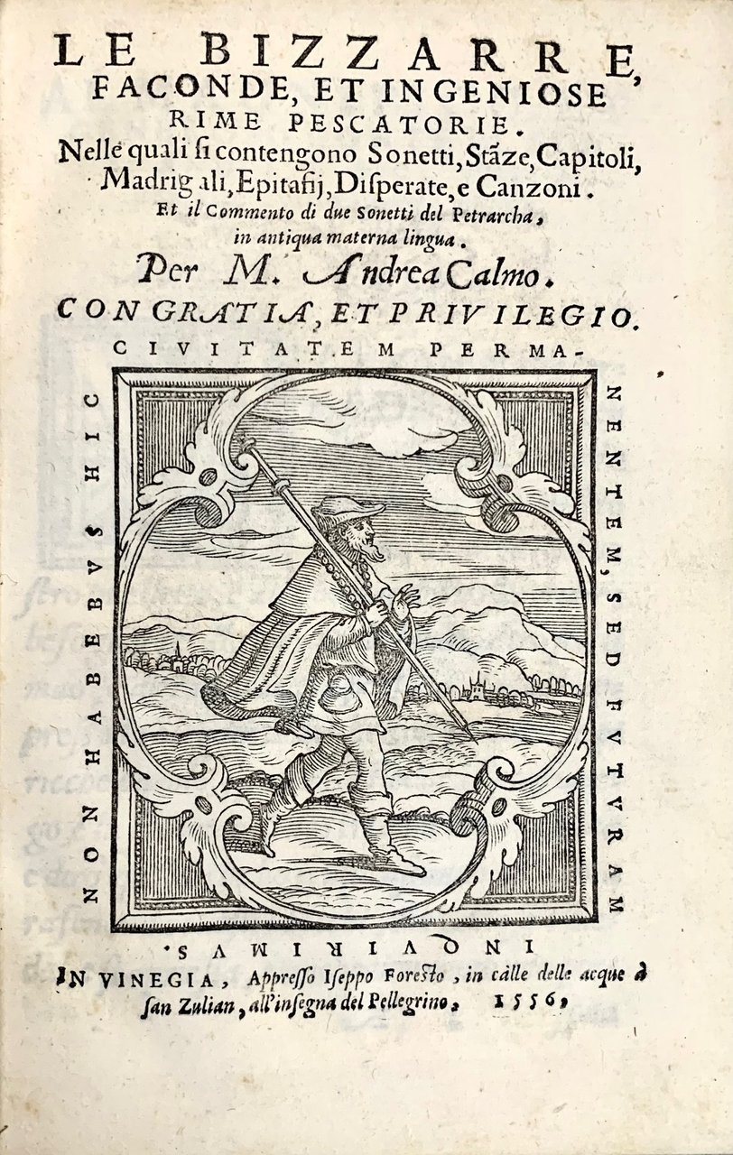 >in-8 (mm155x105), ff. 104; cartonato posteriore decorato, iniziali silografiche, tagli blu. Titolo con grande impresa tipografica di Iseppo Foresto: Pellegrino in cammino con il bordone in spalla con paesaggio sullo sfondo entro elaborata cornice e motto "Non habemus hic ciuitatem permanentem, sed futuram inquirimus". Curiosa raccolta, composta in veneziano o "lingua antiqua" e ispirata alla parodia petrarchesca. Comprende 47 sonetti, 24 stanze, 6 pescatorie, 19 madrigali, 4 disperate, 39 epitaphii de Molimenti Antighi, 6 canzoni, 6 capitoli.