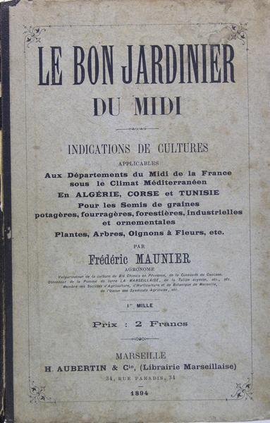 Marseille, H. Aubertin, 1894. In/8 reliure demi-toile, 339 p. Plats tachés, mais feuillets en bon état. Indication de cultures applicables aux départements du Midi de la France sous le climat Méditerranéen, en Algérie, Corse et Tunisie pour les semis de graines potagères, fourragères, forestières, industrielles et ornementales, plantes, arbres, oignons à fleurs, etc.