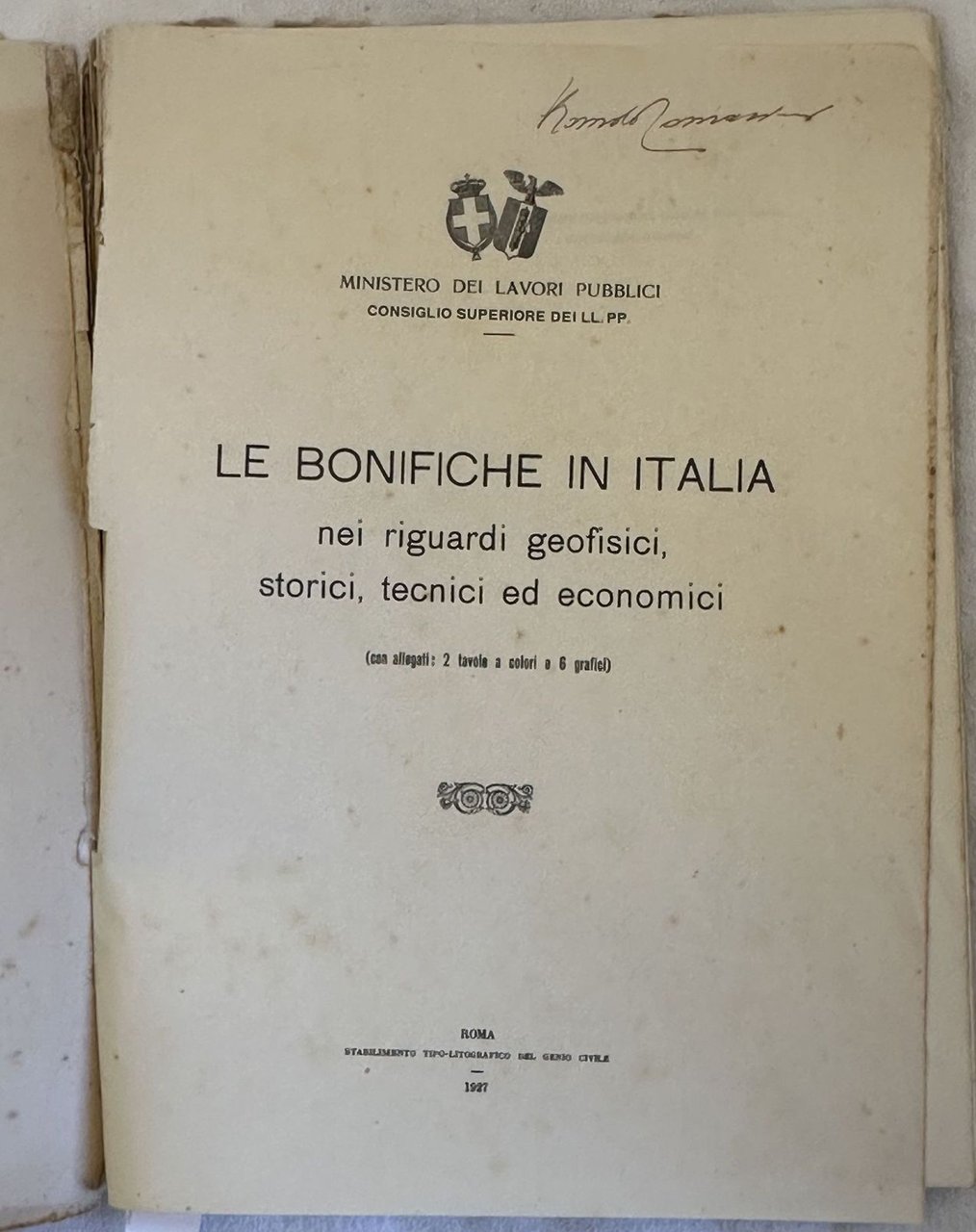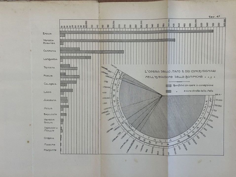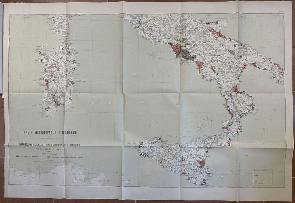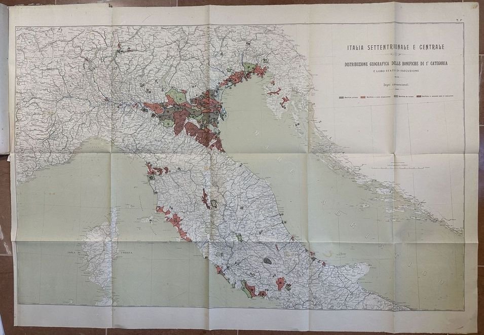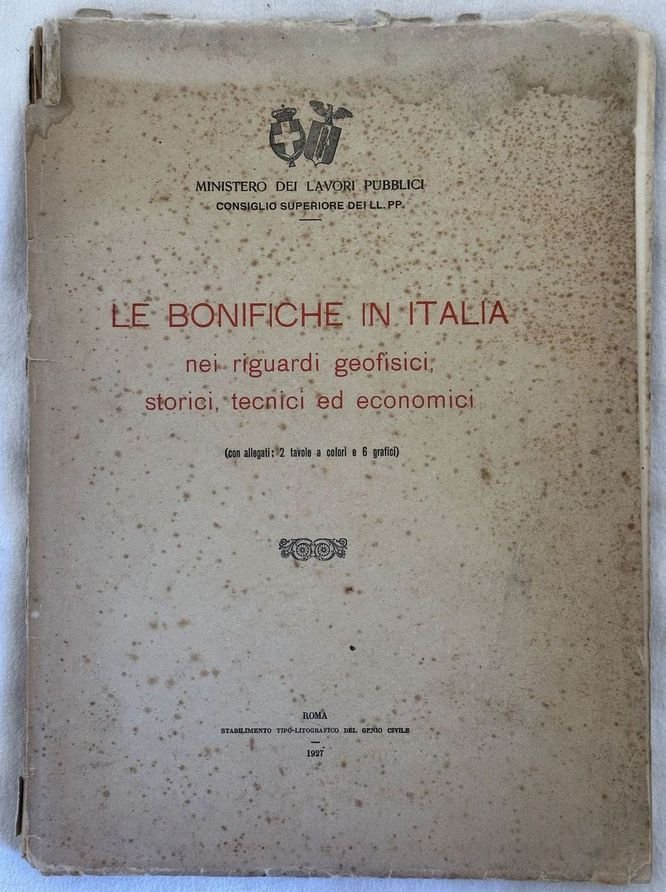 Interessante volume del 1927 sulle bonifiche in Italia nei riguardi geofisici storici tecnici ed economici edito dal Ministero dei lavori pubblici. All'interno: Distribuzione geografica delle bonifiche di prima categoria nel Regno, Origine geofisica dei terreni paludosi, Opere di bonifica più importanti dell'antichità del medico evo e dell'evo moderno, Attività e provvedimenti del Governo Italiano, Risultati ottenuti nell'Italia Settentrionale, Risultati ottenuti nell'Italia Centrale, Risultati ottenuti nell'Italia Meridionale ed Insulare ecc. Alla fine otto tavole ripiegate alla fine, qualcuna a colori. In buone condizioni. Copertina editoriale in discrete condizioni generali con lievi usure ai margini e dorso. Legatura in discrete condizioni con lievi rotture. Pagine in buone condizioni con rare fioriture. In folio. Dim. 33,5x24 cm. Pp. 61+(3)+8 pl. Interesting volume of 1927 about drainage in Italy about geophysicial hystorical technical and economical aspects edited by Ministero dei lavori pubblici. At the end eight folded plates at the end, some are coloured. In good conditions Editorial cover in fair general conditions lightly worn in the extremities. Binding in fair conditions with light cracks. Inside pages are in good conditions with occasional foxing. In folio. Dim. 33,5x24 cm. Pp. 61+(3)+8 pl.