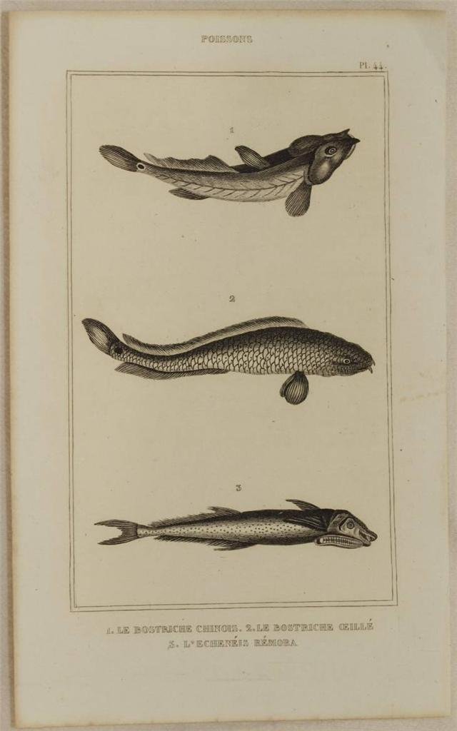 Bella incisione probabilmente della metà del XIX secolo tratta dalla monumentale opera di storia naturale di Buffon, carta spessa. L'incisione rappresenta tre specie di pesci tra i quali la remora. In buone condizioni, fioriture. Usure al margine sinistro. TECNICA: Incisione DIMENSIONI FOGLIO: cm 20x12,5 DIMENSIONI INCISIONE: cm 14x9 EPOCA: 1850 circa Buffon fu un'esponente del movimento scientifico legato all'illuminismo e le sue teorie influenzarono le generazioni successive di naturalisti in particolare Jean Baptiste Lamarck e Charles Darwin. Questa è la sua opera più celebre ed è l'"Histoire Naturelle" pubblicata per la prima volta tra il 1749 ed il 1789 in 36 volumi di cui 8 postumi grazie al lavoro di Bernard Lacepede. Buffon espone tutto il sapere dell'epoca nel campo delle scienze naturali e proprio in questo scritto rilevò le somiglianze tra l'uomo e la scimmia e la possibilità di una genealogia comune. Nice engraving of probably half of the XIX century, taken from the monumental work of natural history by Buffon, wide paper. The engraving represents three species of fishes between them the remora. In good conditions, foxings. Wearings in the left edge. TECHNIQUE: Print LEAF SIZE: cm 20x12,5 PRINT'S SIZE: cm 14x9 PERIOD: 1850 circa Buffon was an exponent of the scientific movement connected to illuminism and his theories inspired the next generations of naturalists in particular Jean Baptiste Lamarck and Charles Darwin. His most famous work is l'"Histoire Naturelle" published for the first time between 1749 and 1789 in 36 volumes of which 8 are posthumous thanks to the work of Bernard Lacepede. Buffon exposes in the work all the notions in natural history and in this writing in particular underlined the similarity between monkeys and man with a possibility of common genealogy.
