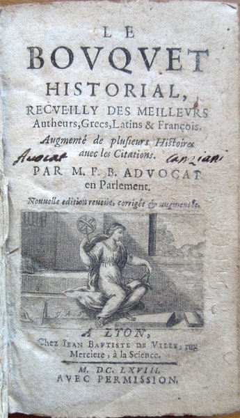 Le bouquet historial, recueilly des meilleurs Autheurs, Grecs, Latins & François. Augmenté de plusieurs Histoires avec les Citations. Par M. F. B. Advocat en Parlement. Nouvelle edition reveùe, corrigée et augmentée