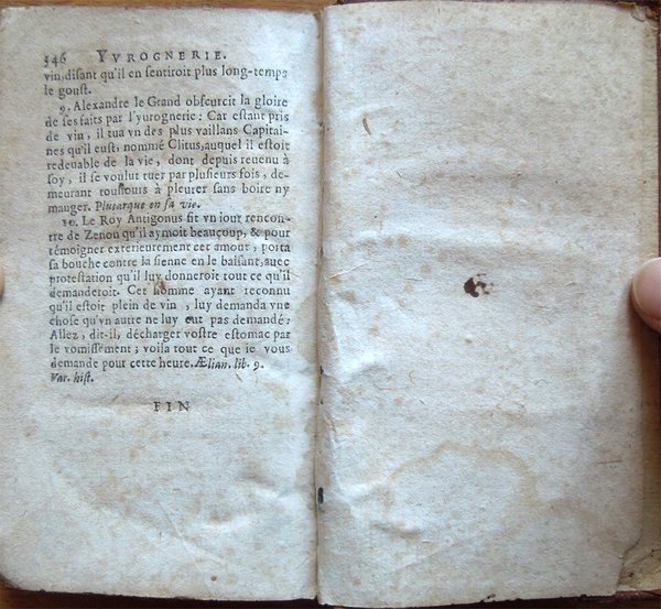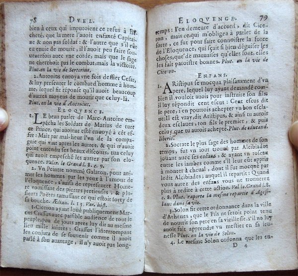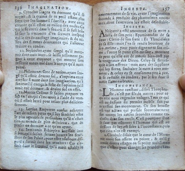 In-24° (13,5 x 8 cm), pp. (12), 346, (2), legatura in piena pelle con dorso a cinque scomparti. Titoli e fregi al dorso. Tracce d'uso e del tempo alla legatura, in particolare, piccole mancanze nella parte superiore delle cerniere e con una mancanza di 1,3 cm nella parte inferiore del dorso. Al frontespizio, incisione allegorica e firma coeva d'appartenenza. Tagli decorati a spruzzo. Mancano le carte di guardia. Ai fogli con le pagine dalla 1 alla 10 e dalla 15 alla 24, nell'angolo inferiore interno, piccola mancanza, lontana dal testo. Alle pagine 341-342, all'altezza del terzultimo rigo, macchia, di 0,6 cm di diametro, di color marrone, con testo che rimane leggibile. Qualche piccolo leggero, alone d'umido, per il resto, ben conservato. Raccolta di esempi storici, relativi a vari argomenti, tratti da autori greci, latini e francesi. Dall'avviso dell'autore al lettore: «Toutes les actions des mortels doivent avoir leur objet à la recherche des choses vertueuses, et à la fuite des vicieuses, pour atteindre à la vraye perfection; a quoy on ne peut parvenir que par un travail indicible en la lecture des bons livres, dont le nombre est tres-grand. C'est pourquoy pour faciliter ce chemin, et profiter à toute sorte de personnes, i'ay recueilly dans tous les meilleurs Historiens Grecs, Latins et François, les plus belles fleurs dont ce Bouquet Historial est composé sur une infinité de divers sujets compris par ordre Alphabetique, qui font voir et connoistre la recompense des oeuvres vertueuses, où quelque humeur que ce foit, pourra trouver quelque chose à son goust s'il n'est grandement depravé». Gli argomenti affrontati, disposti in ordine alfabetico, vanno dall'adulterio alla bellezza, dall'astrologia alla speranza, dal duello alla passione, dalla scienza al vizio. Di seguito il dettaglio: Aage; Abstinence; Addresse; Adultere; Alliance; Ambassadeurs; Ambition; Amy; Amitié; Amour; Amour coniugal; Animal; Assistance; Astrologie; Attention; Avarice; Babillard; Baisers; Beauté; Blaspheme; Ceder; Charges; Chasteté; Clemence; Colere; Commandement; Confiance; Coniecture; Constance; Conseil; Contention; Correction; Courtoisie; Crainte; Cruautez; Curiositez; Deffiance; Desespoir; Dieu; Diligence; Discours; Discretion; Dissimulation; Division; Dons; Dormir; Duel; Eloquence; Enfans; Ennemy; Enseigner; Envie; Equivoques; Escriture; Esperance; Estude; Excuse; Exemple; Feintise; Femmes; Festin; Fidelitez; Finesse; Flatterie; Folie; Fortune; Foy; Fraternitez; Generositez; Guerre; Habits; Haine; Hardiesse; Hazard; Histoire; Homicide; Homme; Honneur; Honte; Humilité; Hypocrisie; Iactance; Ialousie; Ieu; Ieunesse; Ignorance; Images; Imagination; Incestes; Incostance; Indiscretion; Infidelitez; Ingratitude; Inhumanitez; Iniure; Iniustices; Innocence; Intelligence; Ioye; Iuges; Iustice; Larmes; Liberalitez; Loy; Magnanimitez; Malheurs; Mariages; Medecin; Memoire; Médisance; Mocquerie; Monarchie; Mort; Musique; Necessité; Negligence; Obeissance; Occasion; Occupation; Or; Orgueil; Oysiveté; Paillardise; Pardon; Parents; Passion; Patience; Patrie; Pauvreté; Perfidie; Peur; Philosophie; Pitié; Plaisir; Poësie; Populace; Predictions; Prescience; Present; Prevoyance; Primogeniture; Promesse; Promptitude; Prosperité; Prudence; Recompense; Reconnoissance; Religion; Renommée; Repart; Reprehension; Reputation; Richesses; Roy; Ruses; Sacrilege; Science; Secours; Secret; Sedition; Serviteur; Severité; Silence; Sincerité; Sobrieté; Soif; Soleil; Sommeil; Songes; Temperance; Temporiser; Trahison; Tristesse; Tromperie; Tyrannie; Vanité; Vengeance; Vertu; Vice; Victoire; Vie; Vieillesse; Vin; Volupté; Yeux; Yvrognerie.