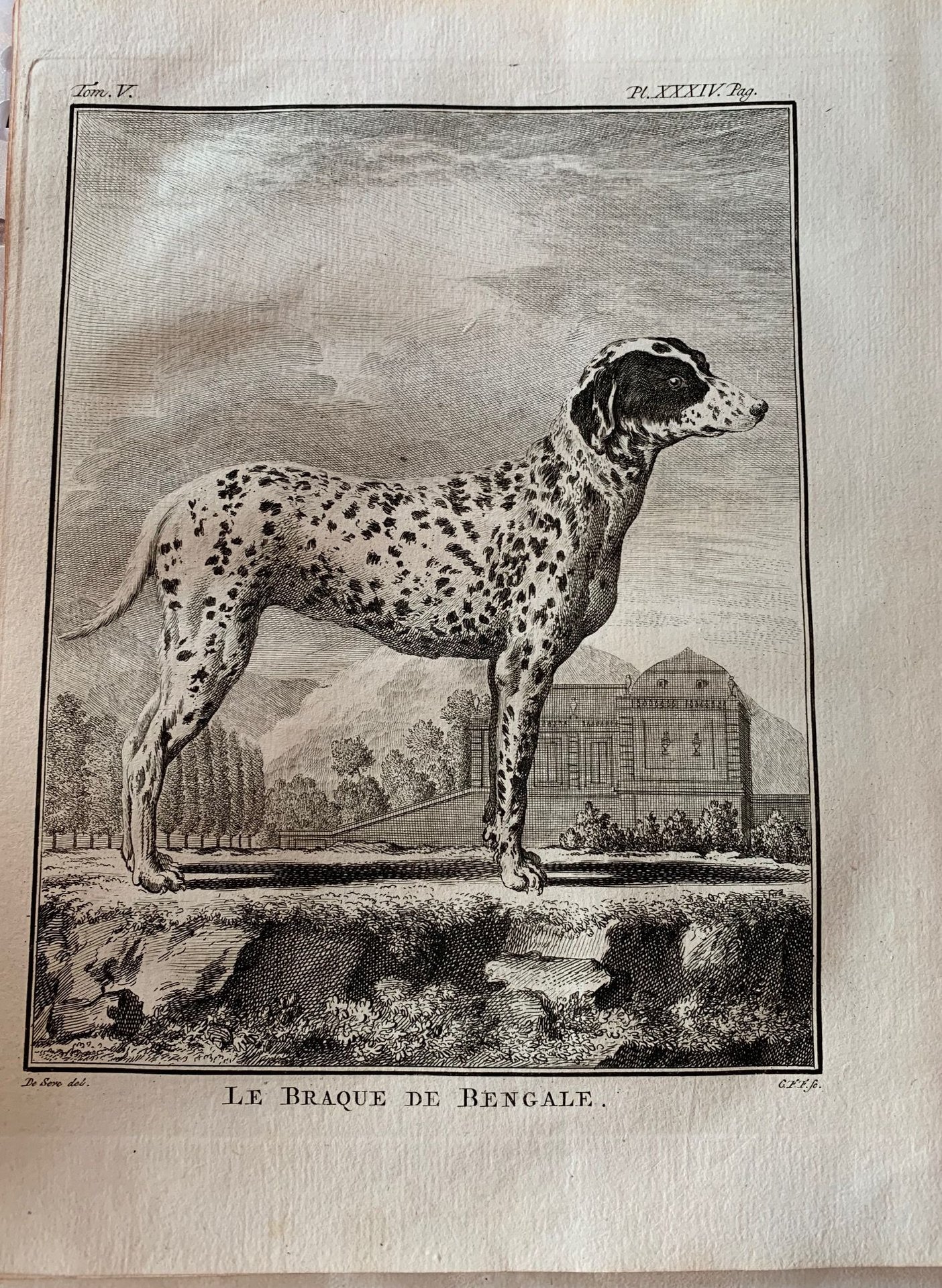 >incisione in rame mm 250x195 raffigurante un bracco. "Le Braque de Bengale", titolo e dati tipografici impressi lungo il margine inferiore. Tratta dalla celebre opera di Buffon: Histoire générale et particulière, importante opera in 36 volumi dedicata alla storia naturale; pubblicata in Francia tra il 1749 e il 1789.