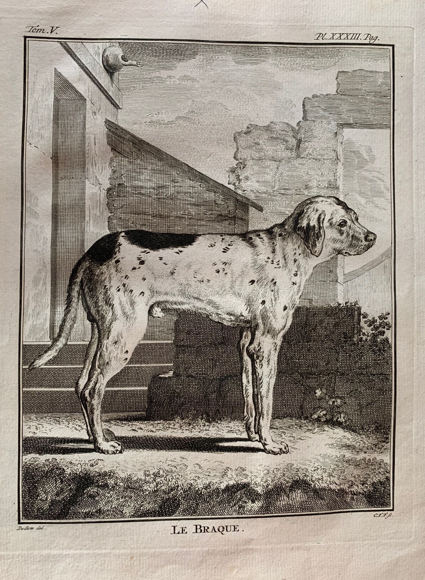 >incisione in rame mm 250x195 raffigurante un bracco. "Le Braque", titolo e dati tipografici impressi lungo il margine inferiore. Tratta dalla celebre opera di Buffon: Histoire générale et particulière, importante opera in 36 volumi dedicata alla storia naturale; pubblicata in Francia tra il 1749 e il 1789.