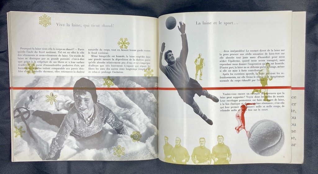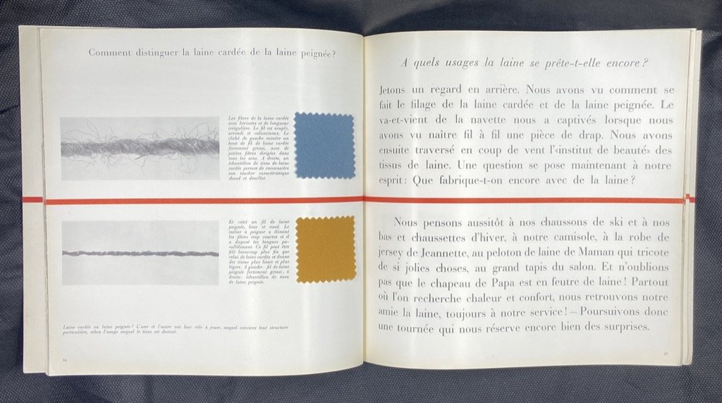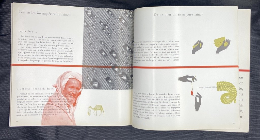 Brossura, cm 21x21, pp 35 (1) illustrate in tricromia nero - verde - rosso, con due campioni di tessuto cardato e pettinato. Ottimo stato. Opuscolo dell'International Wool Secretariat realizzato da Fritz Meyer (1904 - 1980) per l'agenzia di Adolf Wirz (1906 - 1997), che nel 1936 aveva fondato il primo Reklame-Buro indipendente in Svizzera. Negli anni '50 l'International Wool Secretariat, fondato a Londra nel 1936, intensificò la proprie campagne per promuovere l'utilizzo del filato nella moda e in altri campi, pubblicando numerosi opuscoli di raffinata qualità editoriale (ricordiamo quelli italiani disegnati da Jeanne e Franco Grignani, cui si deve anche il celebre logo Woolmark del 1964). Questo «Breviario», apparso all'incirca nel 1950, illustra tecniche di filatura e qualità della fibra con un'efficacissima impostazione grafica che vede un filo rosso attraversare le pagine e un dinamico contrappunto tra immagini in nero e elementi grafici colorati; questo stile asciutto e vibrante, tipico della scuola svizzera, ebbe un enorme impatto sul graphic design italiano tra gli anni '50 e gli anni '60. In Italia fu pubblicata una versione tradotta del fascicolo, con una copertina diversa e col titolo «Dalla pecora al tessuto», che ometteva i nomi degli autori del progetto. Non comune, una manciata di copie in OCLC (a Lione, nell'American Textile History Museum a Cornell, e 3 in Svizzera).