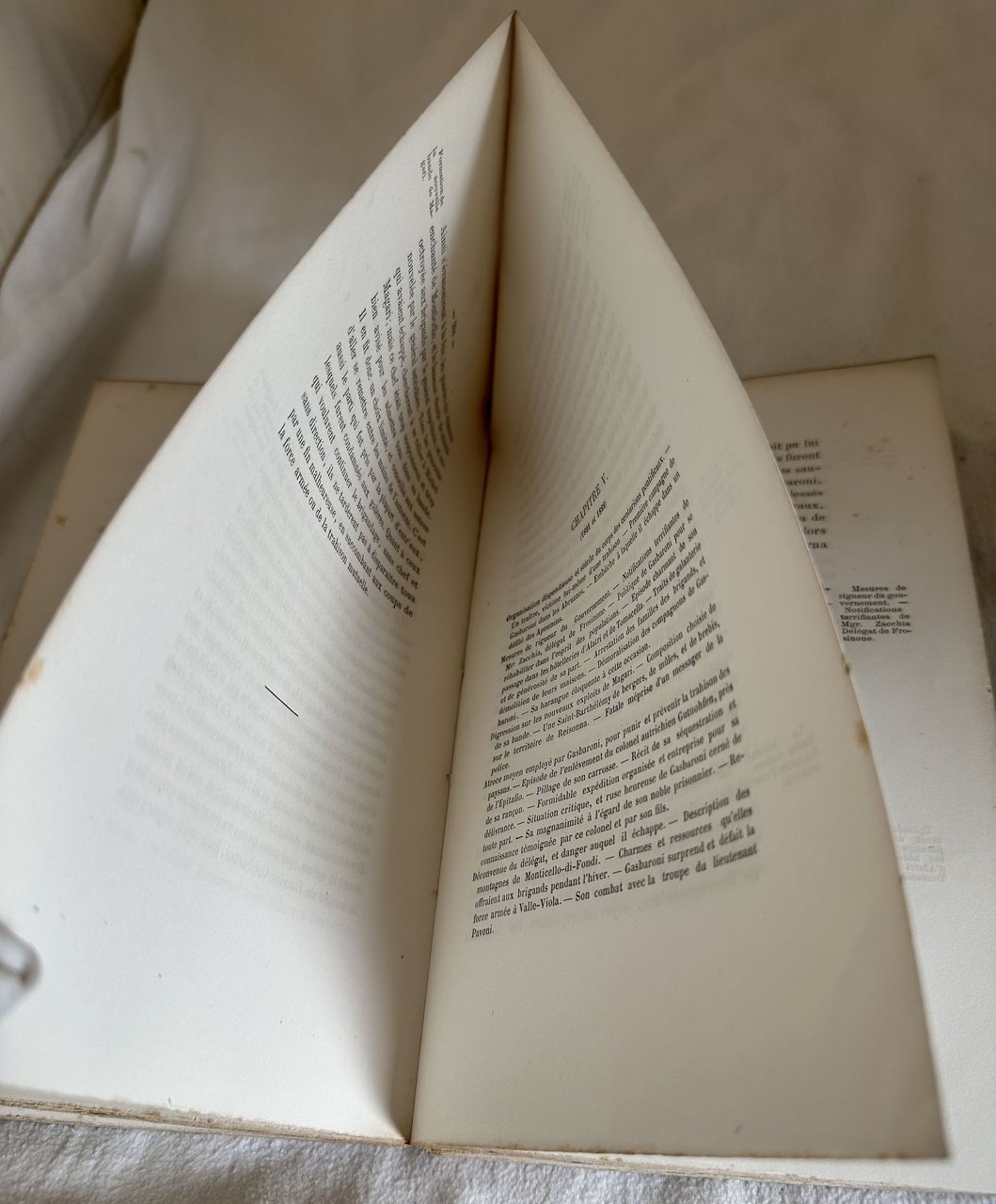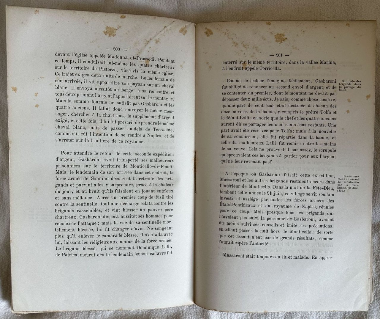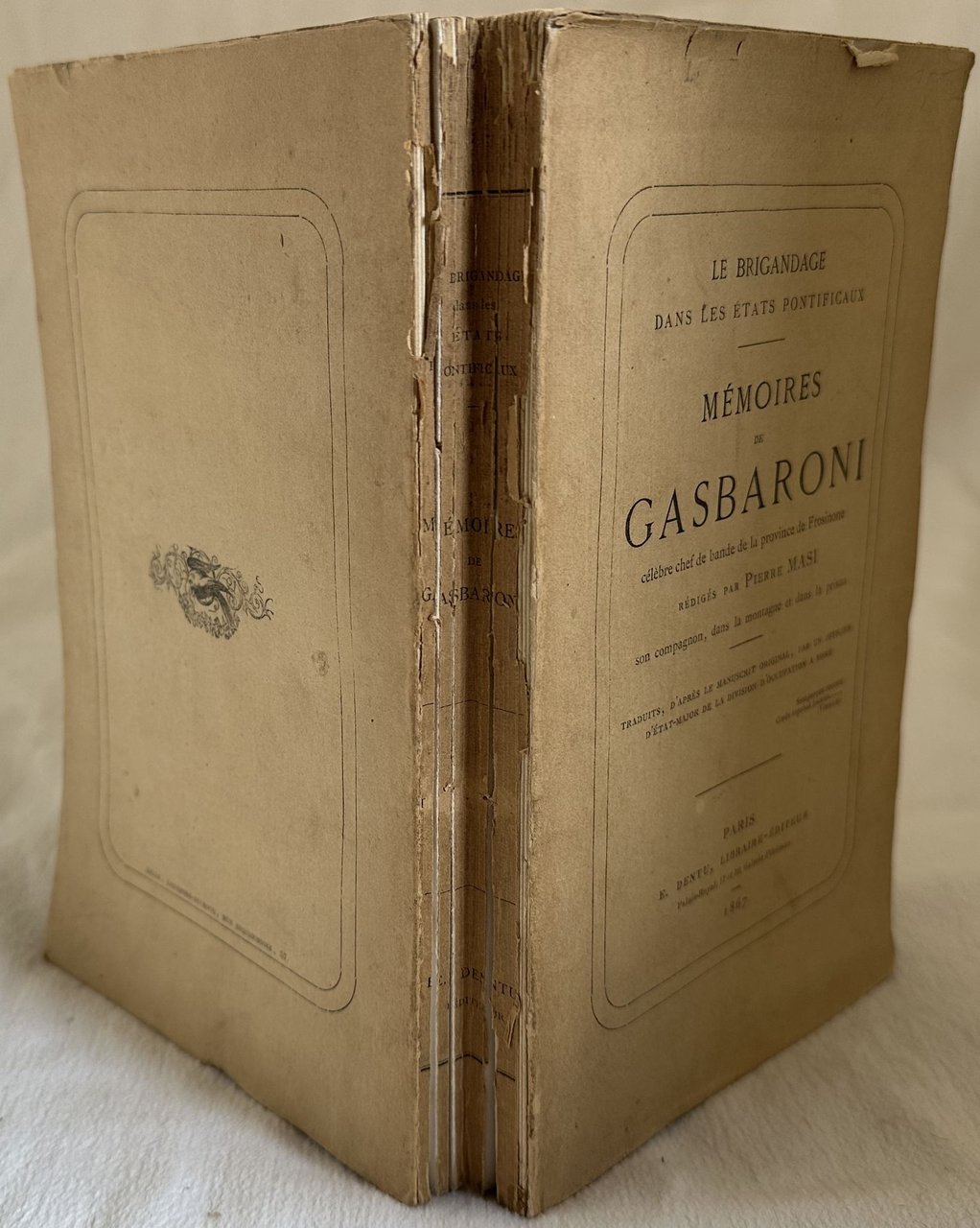 Edizione originale del 1867 di queste memorie di Antonio Gasbarrone (Sonnino 1793-Abbiategrasso 1882) uno dei più celebri briganti dell'Ottocento, redatta da Pietro Masi, uno dei suoi principali compagni. L'opera venne pubblicata in francese a testimonianza di come la fama del brigante riuscì a superare i confini delle Alpi. Perfino Stendhal lo cita più volte nelle sue opere. "Avec un portrait de Gasbaroni en lithographie. Précédés d'une substantielle étude sur l'organisation du brigandage, les présents Mémoires sont entièrement anecdotiques et par leur pittoresque, par le nom des personnages qui s'y trouvent incidemment mêlés (Mgr. Pacca, le cardinal Fesch, Consalvi, etc.), méritent une place à part dans la littérature du genre. Aussi parce que ces brigands furent de 1799 à 1815, les ennemis des Français qui les ménagèrent peu. Enfin et surtout parce que de 1799 à 1828, l'histoire des États pontificaux est entièrement liée à celle du brigandage qui infestait ces pays, et qu'on n'y trouve pas seulement des relations de meurtres, d'incendies ou de pillages, mais aussi de véritables faits de guerres contre les troupes régulières, des entrevues, des traités, voire des alliances ! " (Catalogue Dorbon 527, n. 369). Ritratto di Gasbaroni in antiporta. In discrete condizioni. Copertina editoriale in discrete condizioni generali con usure ai margini e dorso. Legatura in mediocri condizioni con rotture. All'interno le pagine si presentano in buone condizioni con fioriture. In 8. Dim. 22,5x14 cm. Pp. 361.