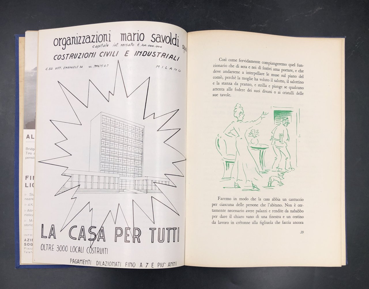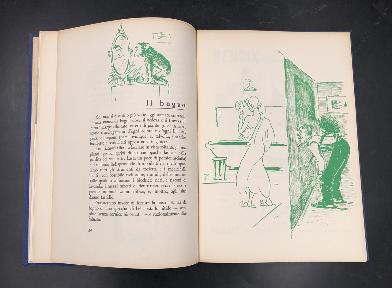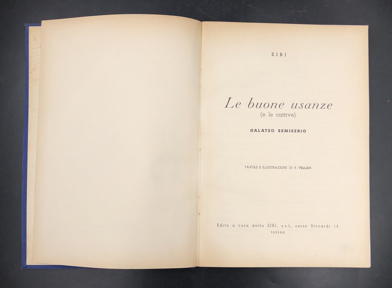 In-8° (cm. 24,8) tela ed. con bel disegnino di Vellan impresso in oro al piatto ant, tit. e filetti oro al dorso (privo di sovracc.), pp. 93, (3) di testo con 62 DISEGNI e disegnini (perlopiù spiritose scenette) in verde di Felice VELLAN + LXXIX, (5) di inserzioni pubblicitarie anche illustrate b.n. di aziende torinesi. In fine tabelle di ricette di bocconcini ecc., salse da farsi clo fruòllino TAPIES, tra cui 18 cocktail. Disponibile allo stesso prezzo un altro es. editorialmente senza disegno oro in cop., ma titolo oro al dorso e illustrazioni interne in verde. Con EX LIBRIS aziendale della SIBI che "studia realizza ogni vostra necessità pubblicitaria con sapienza, eleganza ed originalità", illustrato e con grafica in rosso, certo di Vellan. Cerniera interna post. quasi staccata.
