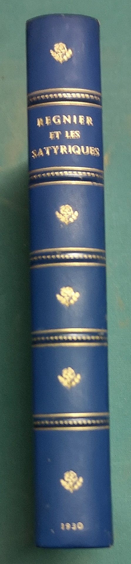 >in-8 broché, pp. 250. Bella legatura d'amatore in m. pelle azzurra, titolo e fregi in oro su dorso a nervi, broch. edit. conservata. Edizione di 2615 esemplari numerati (n. 2102) su carta forte di questa "Recueil de poésies libres, rares ou peu connues, pour servir de Supplément aux Oeuvres dites complètes des poètes français Mathurin Regnier et les satyriques." Perfetto esemplare.