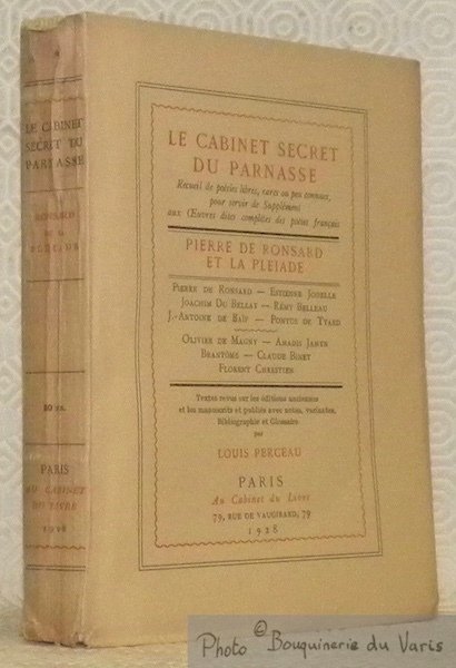 Le Cabinet secret du Parnasse. Recueil de poésies libres, rares ou peu connues, pour servir de Supplément aux Oeuvres dites complètes des Poètes français. Pierre de Ronsard et la Pléiade. Pierre de Ronsard - Estienne Jodelle - Joachim Du Bellay - Rémy Belleau - Brantôme - Claude Binet - Florent Chrestien. Textes revus sur les Editions anciennes et les manuscrits et publiés avec notes, variantes, Bibliographie et Glossaire par Louis Perceau.