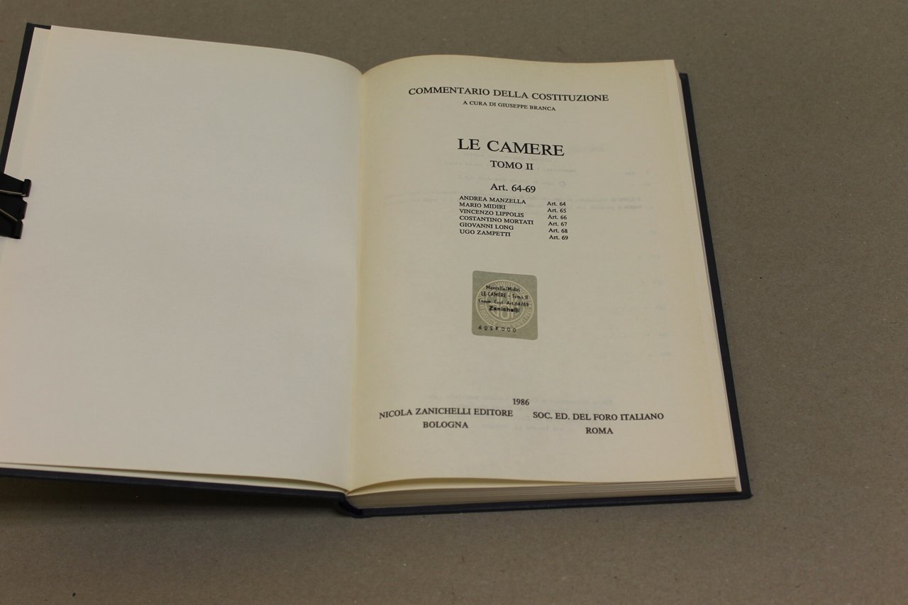 AA.VV. Le Camere. Tomo II. Bologna, Zanichelli 1986 italiano, 24,5 17,5 pp.284 Commentario delle Costituzione a cura di Giuseppe Branca. Le Camere, Tomo II. Art. 64-69.