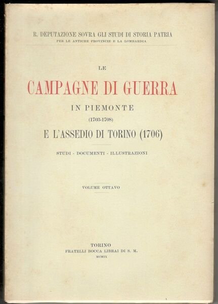 In 8° grande (cm. 27 x 19), pp. (4), 531, (5). Brossura editoriale. Copia molto buona, interamente a fogli chiusi. Pubblicazione della R. Deputazione sovra gli studi di Storia Patria per le antiche provincie e la Lombardia. Contiene: CASANOVA, Eugenio. Censimento di Torino alla vigilia dell'assedio (29 agosto - 6 settembre 1705). - MAGRINI, Effrem. La popolazione di Torino nel 1705. (Con un diagramma). - CARUTTI, Domenico. Il maresciallo Rehbinder. - CASANOVA, Eugenio. Alla biografia di Pietro Micca e di Maria Chiaberge Bricco e alla storia del voto di Vittorio Amedeo II. - CASANOVA, Eugenio. Gli archivi camerali durante l'assedio di Torino (1705-1706). DE REGE DI DONATO, Paolo. Ordine di battitura di monete ossidionali di Torino (1706). - ZUCCHI, Mario. Giornale inedito dell'assedio di Torino (11 maggio - 7 settembre 1706). - PROVANA DI COLLEGNO, Luigi. Lettere di Carlo Giacinto Roero conte di Guarene. - MILANO, Euclide. La partecipazione alla guerra di successione spagnuola della città di Bra. - ACCAME, avv. Paolo. La Repubblica di Genova e la guerra per la successione di Spagna. - SCARZELLO, Oreste. Corneliano, Piobesi, Monticello d'Alba e Sommariva Perno negli anni di guerra, 1704-1708.