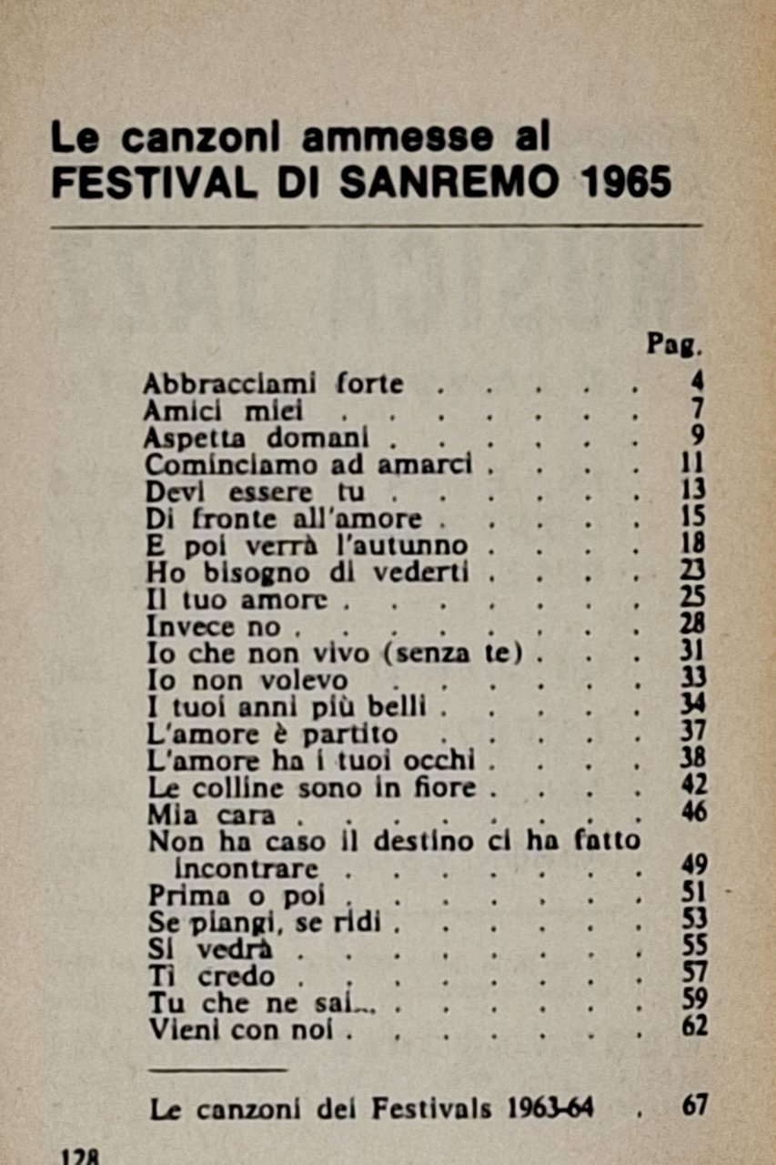 Raccolta di tutte le canzoni di successo. Formato: 9 x 12,5 cm circa. Pagine: 128. Stato di conservazione: leggere pieghette e due o tre minuscoli taglietti sui bordi della copertina (che presenta piccole macchioline del tempo) ma, nel complesso, un buon esemplare. Privo di timbri, firme di appartenenza, annotazioni o altri segni nel testo. Copertina editoriale flessibile, illustrata a colori. Con illustrazioni fotografiche in nero degli interpreti delle canzoni (tra cui Ornella Vanoni, Cigliola Cinquetti, Betty Curtis, Iva Zanicchi, i Minstrels, Daniel Gerard, Audrey, Bobby Solo, Milva, Les Surfs, .). Il libretto, da pagina 65, riporta anche le canzoni dei festivals di Sanremo 1963-1964.