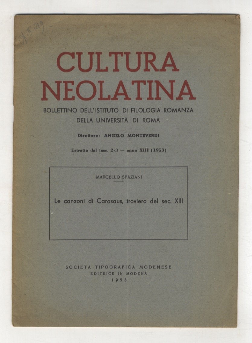 Modena, Società Tipografica Modenese, 1953, in-8, br. editoriale, pp. 14. Estratto da "Cultura neolatina, fasc. 2-3, anno XIII.