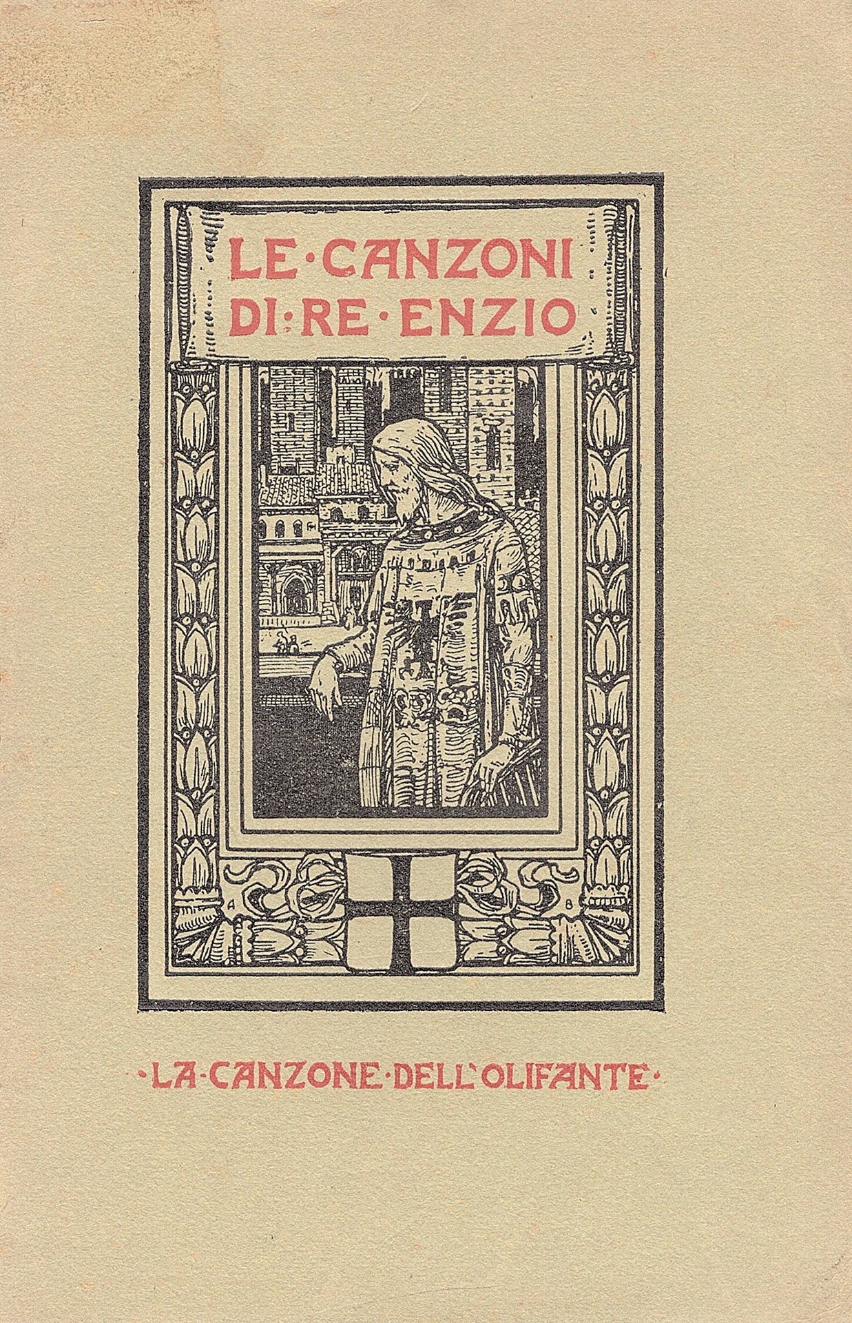 In-16° grande, pp. (8), 88, brossura editoriale verdina con titolo in rosso e illustrazione xilografica in nero raffigurante il Re Enzio e, sullo sfondo, le torri felsinee medievali. Sovraccoperta con titolo, filetto e xilografia in rosso di Alfredo Baruffi. Il frontespizio riproduce la stessa xilografia del piatto anteriore; antiporta xilografica figurata e incisioni xilografiche in b.n. n.t. dello stesso Baruffi. Ex-libris figurato moderno. Senza la sovraccoperta. Prima edizione. 'Opera del periodo bolognese e dedicata, quasi un tributo d'omaggio, alle memorie di quella città. Comprende tre parti o canzoni: 'La canzone del Carroccio', 'La canzone del Paradiso', 'La canzone dell'Olifante'. Di qui il titolo, con riferimento alle 'chansons de geste', di cui riproduce il metro in lasse di endecasillabi chiusi da un settenario, e il tono che vuol essere epico-eroico, conveniente alla materia trattata, storica e leggendaria insieme: la storia del comune bolognese nel suo momento più glorioso, dopo la battaglia di Fossalta e la cattura di re Enzio, figlio di Federico II. Di qui ha inizio il racconto: tutto il popolo si prepara ad andare incontro ad Innocenzo IV, lungo la via Emilia, schierato intorno al Carroccio vittorioso. (.) Segue la 'Canzone del Paradiso', di contenuto in gran parte idillico, col racconto degli amori di Enzio con una schiava del contado, Flor d'Uliva. E' qui una delle pagine più belle del Pascoli di poesia d'amore.' (Carlo Curto, in Diz. Bompiani d. Opere, II, pag. 90). Gambetti / Vezzosi, p. 646.