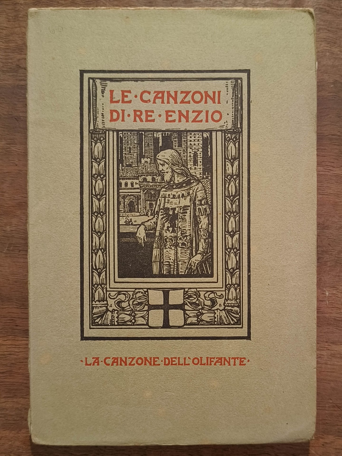 Le canzoni di re Enzio. La canzone dell'olifante, Bologna, Zanichelli, 1908. Prima edizione. Cm 19. Pp. (6) 74 (6). Brossura editoriale verde leggermente sciupata. Xilografie di Alfredo Baruffi nel testo.