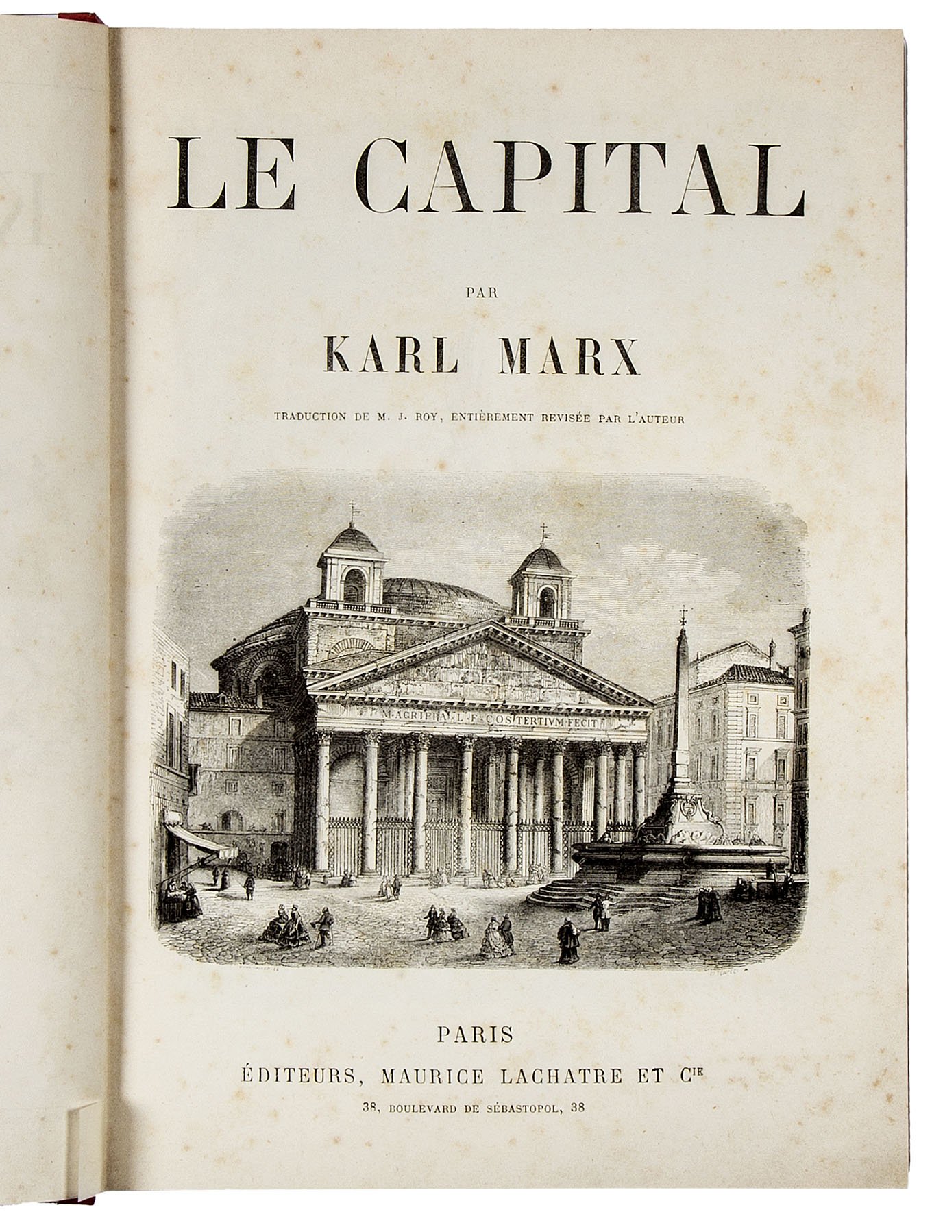 Prima edizione, prima tiratura, della prima traduzione francese del primo volume di Das Kapital. La traduzione di M.J. Roy si basa sul manoscritto della seconda edizione tedesca. Marx aveva modificato il testo originale e aveva inviato una copia del manoscritto revisionato dell'opera all'editore socialista parigino Maurice Lachâtre, amico di Proudhon, prima ancora della pubblicazione dell'edizione di Amburgo del giugno 1872. Marx considerava questa traduzione francese come un'opera originale, “che ha un valore scientifico indipendente dall'originale e dovrebbe essere consultata anche dai lettori che conoscono la lingua tedesca” (vedi l'Avis au lecteur, p. 348).