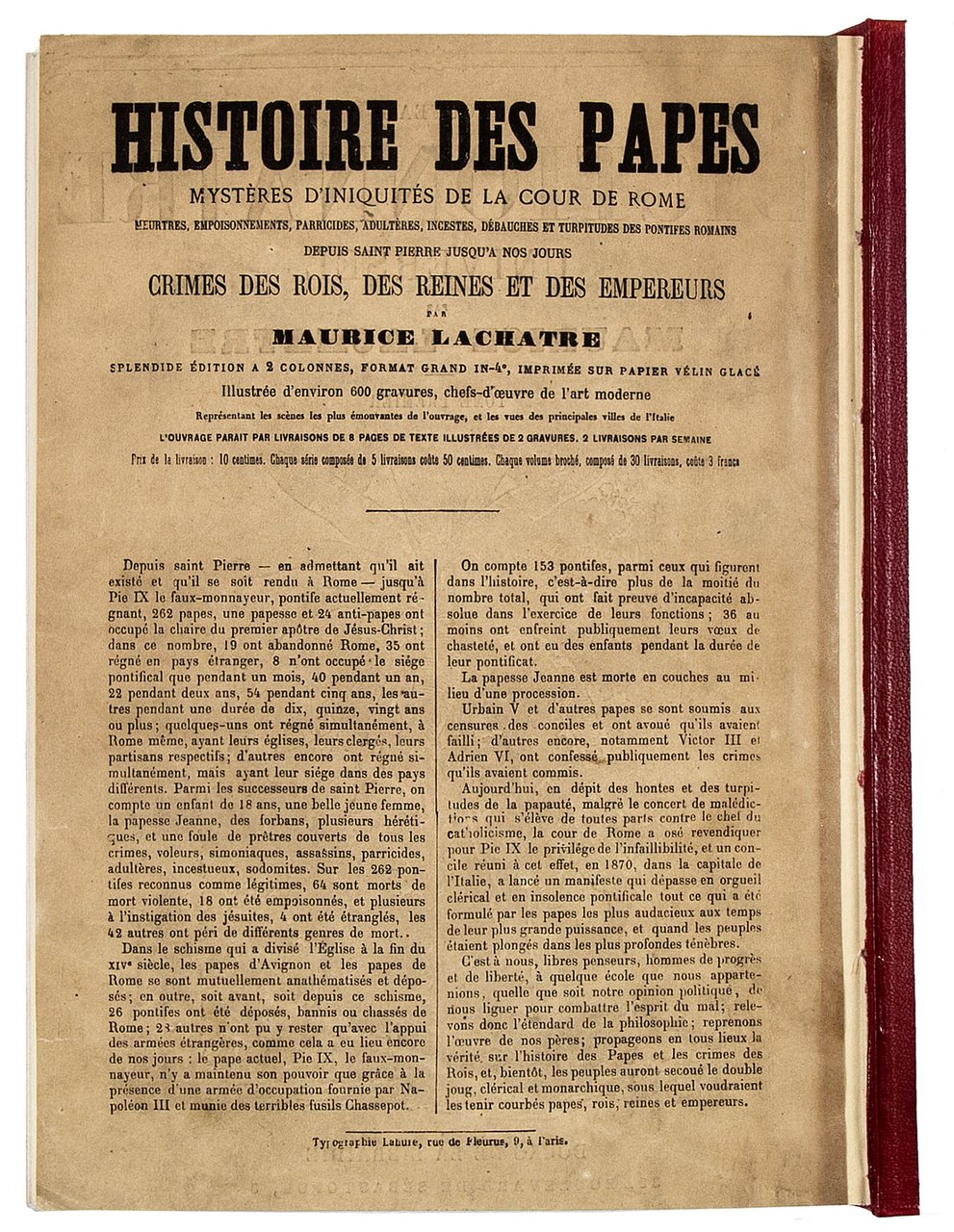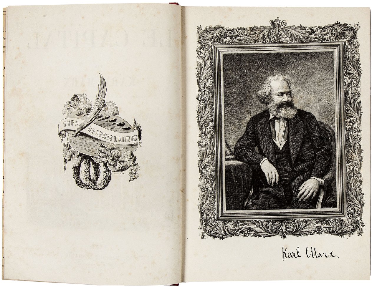 In folio piccolo (mm. 276x192). Pp. 351, [1] compredenti: l'occhietto con vignetta allegorica e l'indicazione “1re Livraison, Prix de la Livraison: dix centimes”; il titolo con una vignetta che mostra il Pantheon al recto e la marca della Typographie Lahurf al verso; il ritratto a piena pagina di Marx con la sua firma in calce; il facsimile di una lettera inviata da Marx all'editore Maurice Lachâtre (con replica al verso: “Au citoyen Karl Marx”); la Préface de la première édition datata 25 luglio 1875 (p. [9]); l'Avis au lecteur datato Londra, 28 aprile 1875 (p. 348); l'Extraits de la postface de la seconde édition allemande (pp. 348-351); l'errata (p. 351); ed infine l'indice delle materie sull'ultima pagina. Testatine e finalini incisi. Testo stampato su due colonne a partire da p. [13]. Legatura recente in mezzo marocchino con titolo in oro al dorso, i piatti sono stati realizzati con dei pannelli di plexiglas trasparente che permettono di vedere le brossure editoriali ancora presenti. Qualche lieve fioritura, ma ottima copia.