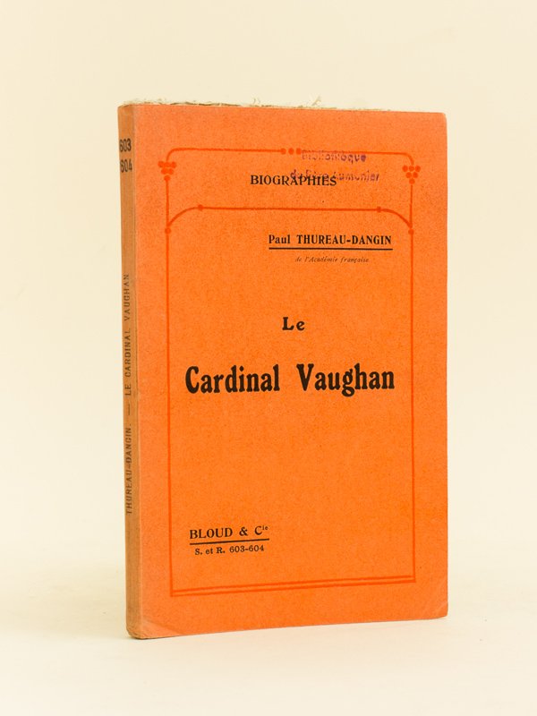 1 vol. in-12 br., Librairie Bloud et Cie, Paris, 1911, 126 pp. Etat très satisfaisant (ancien cachet discret d'institution religieuse, bon état par ailleurs). Historien, auditeur au Conseil d'Etat et académicien, Paul Thureau-Dangin était un catholique qui s'est particulièrement intéressé au catholicisme au Royaume-Uni. Sur ce thème, il publia notamment "Le catholicisme en Angleterre" (1909), "Newman catholique' (1912) et "La renaissance catholique en Angleterre au XIXe siècle". Dans le présent petit ouvrage, Thureau-Dangin s'intéressait au cardinal Herbert Vaughan (1832-1903), disciple du futur cardinal Manning, auquel il succéda comme archevêque catholique de Westminster.